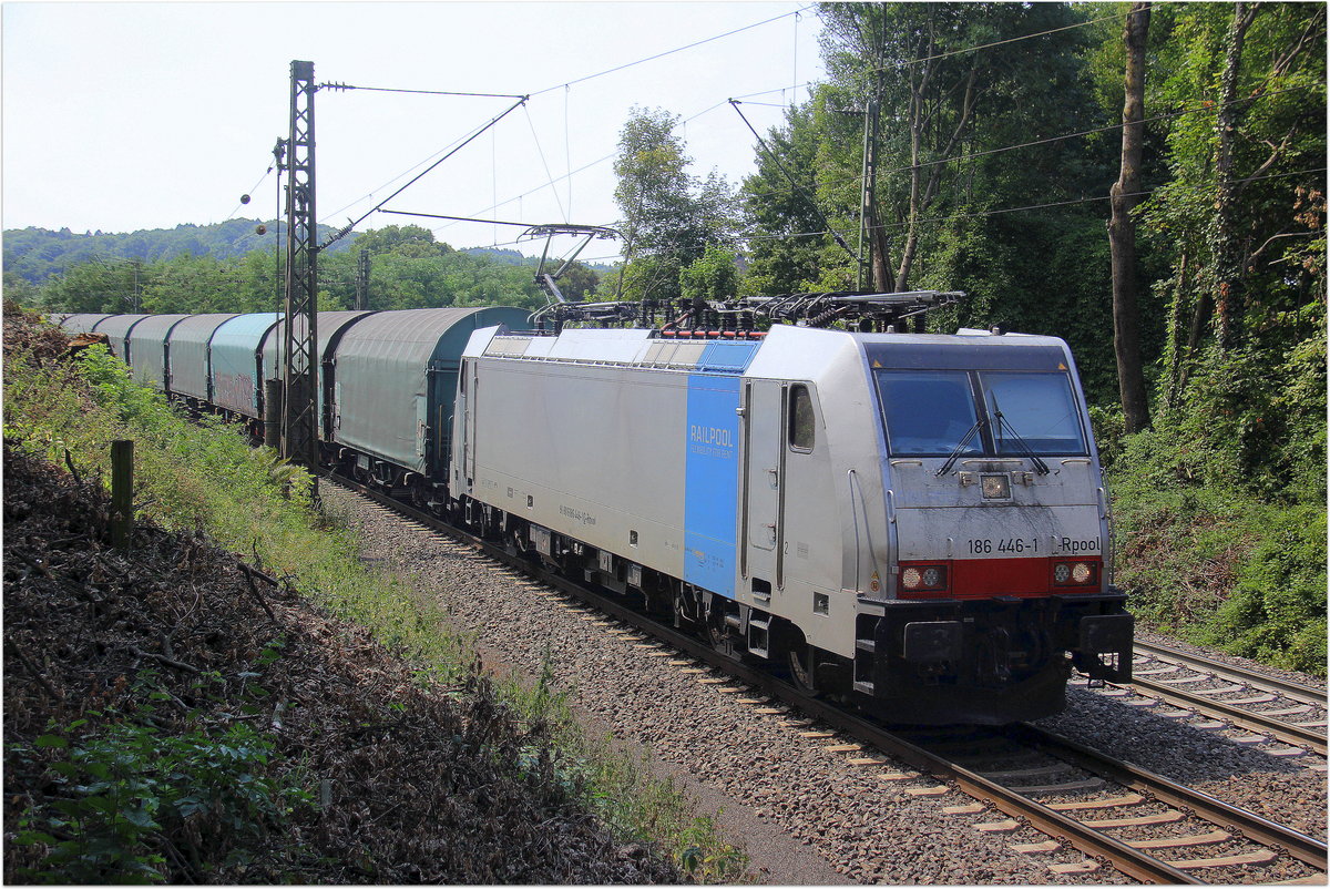 186 446-1 von Lineas/Railpool kommt die Gemmenicher-Rampe herunter nach Aachen-West mit einem Coilzug aus Kinkempois(B) nach Landshut(D). Aufgenommen an der Montzenroute am Gemmenicher-Weg. Bei Sommerwetter am Nachmittag vom 25.7.2018.