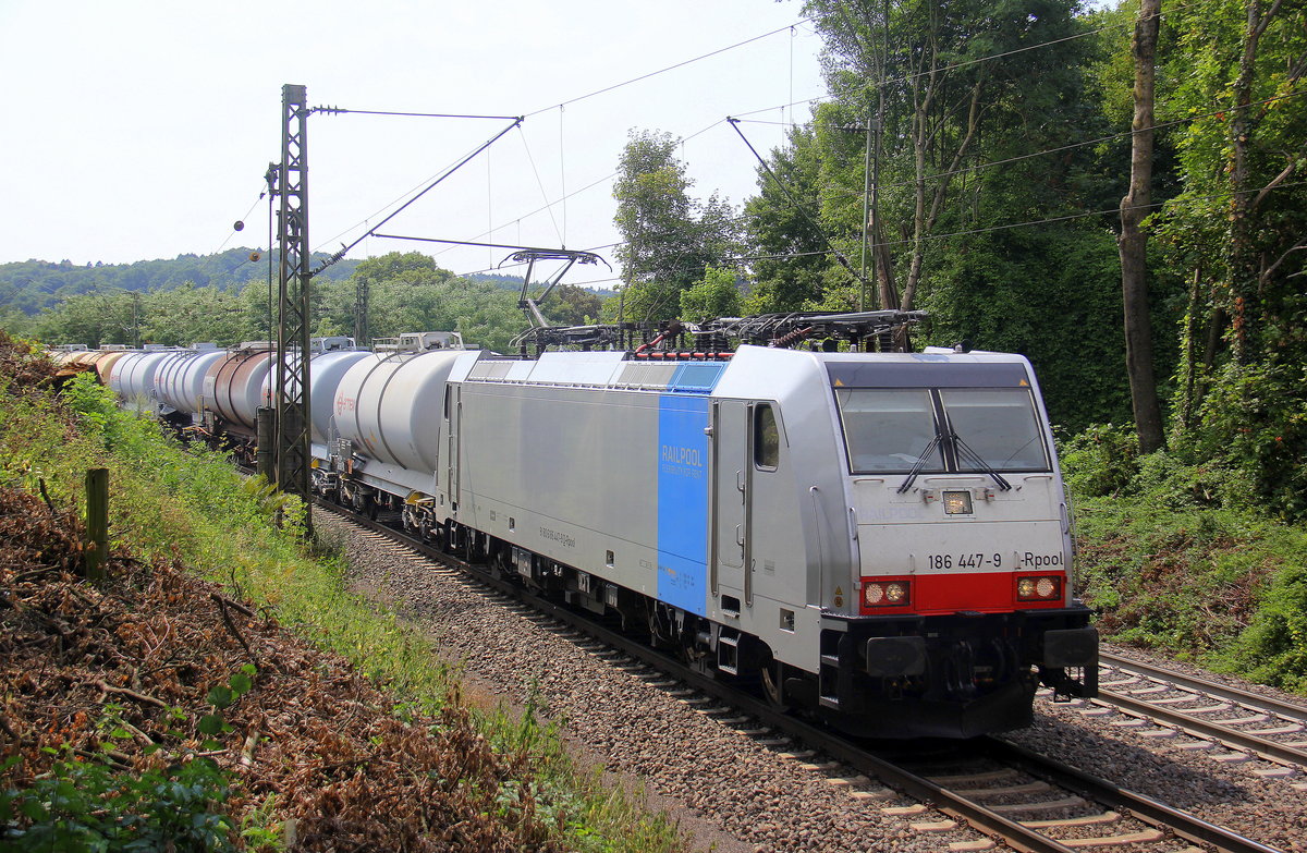 186 447-9 von Lineas/Railpool kommt die Gemmenicher-Rampe herunter nach Aachen-West mit einem Kesselzug aus Antwerpen-Kanaaldok(B) nach Millingen-Solvay(D).