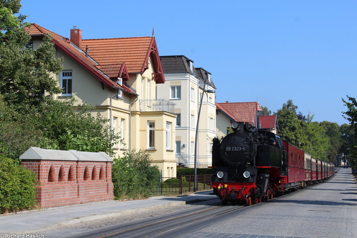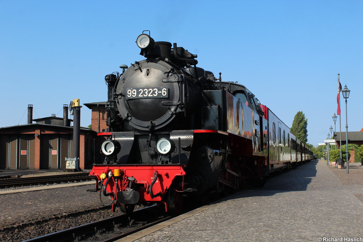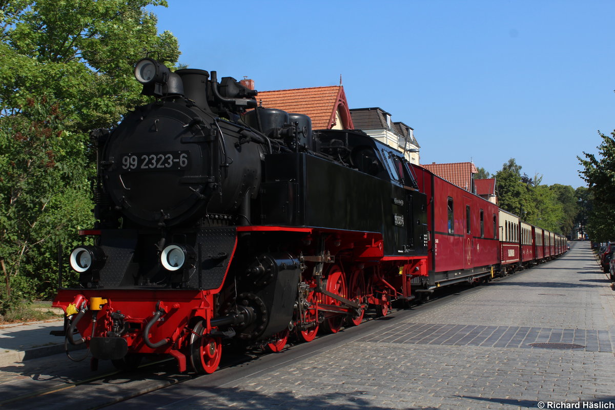 99 2323-6 rollt gerade in den Halt Bad Doberan Goethestraße hinein.