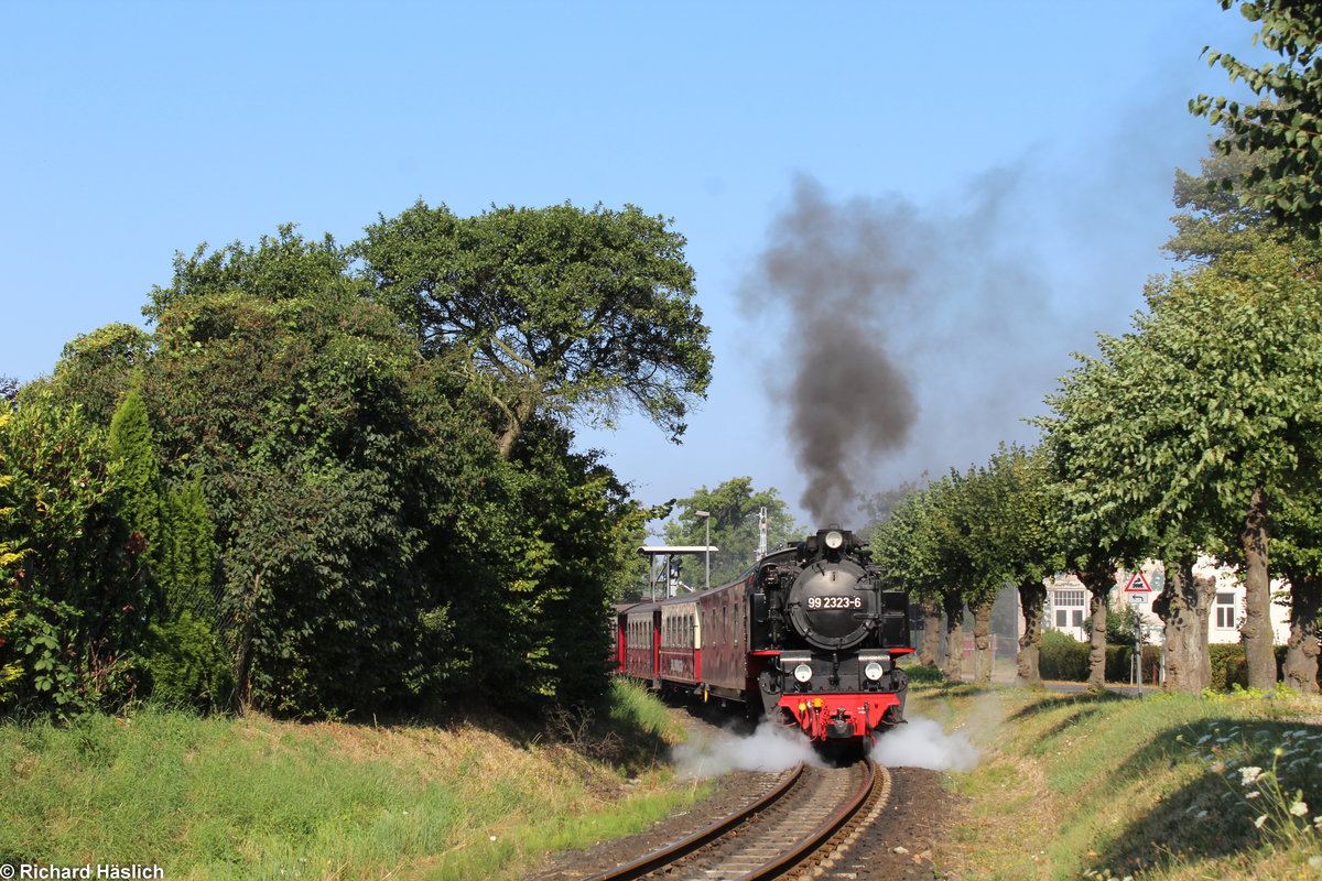 99 2323-6 schleicht aus dem Bahnhof Kühlungsborn West in Richtung Bad Doberan hinauf.