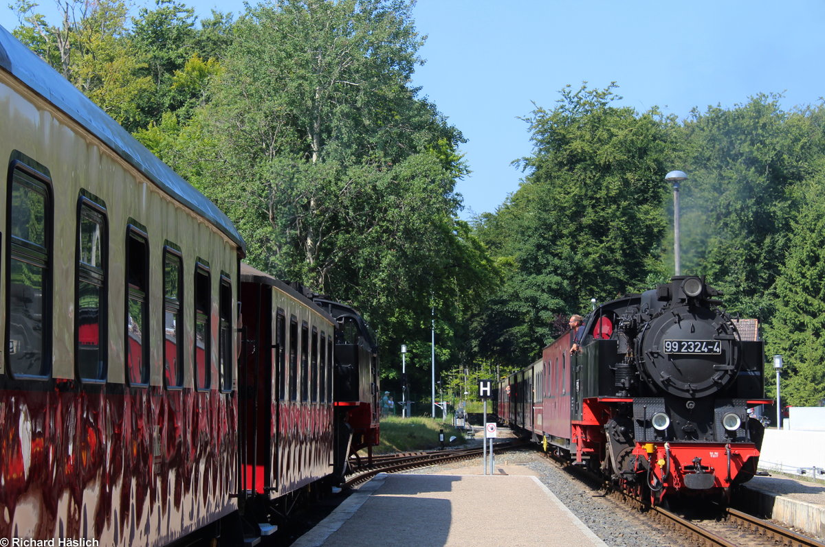 99 2324-4 kreuzt gerade mit 99 2323-6 im Bahnhof von Heiligendamm.