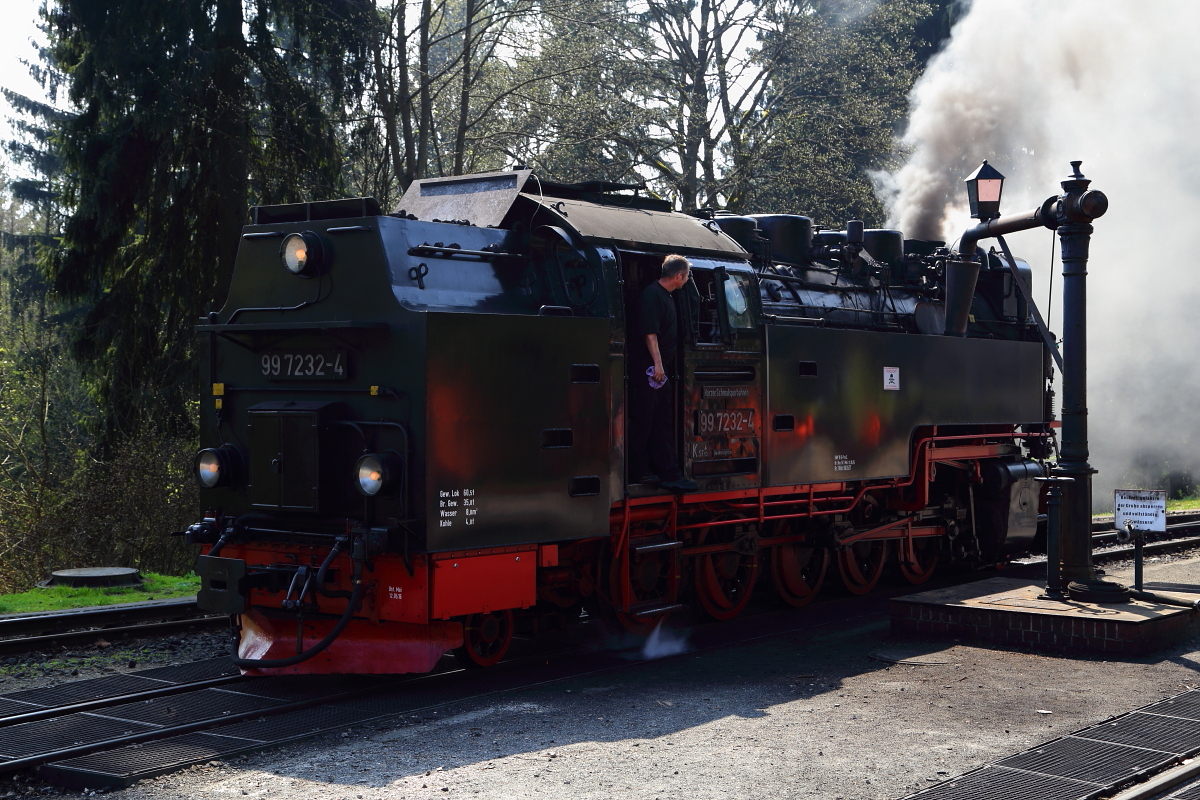 99 7232 am Mittag des 21.04.2018 beim Wasserfassen im Bahnhof Drei Annen Hohne. Nach Abschluß des Vorgangs wird sie P 8920 aus Nordhausen auf den Brocken bringen.