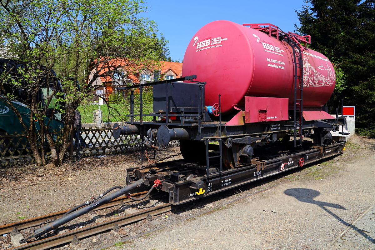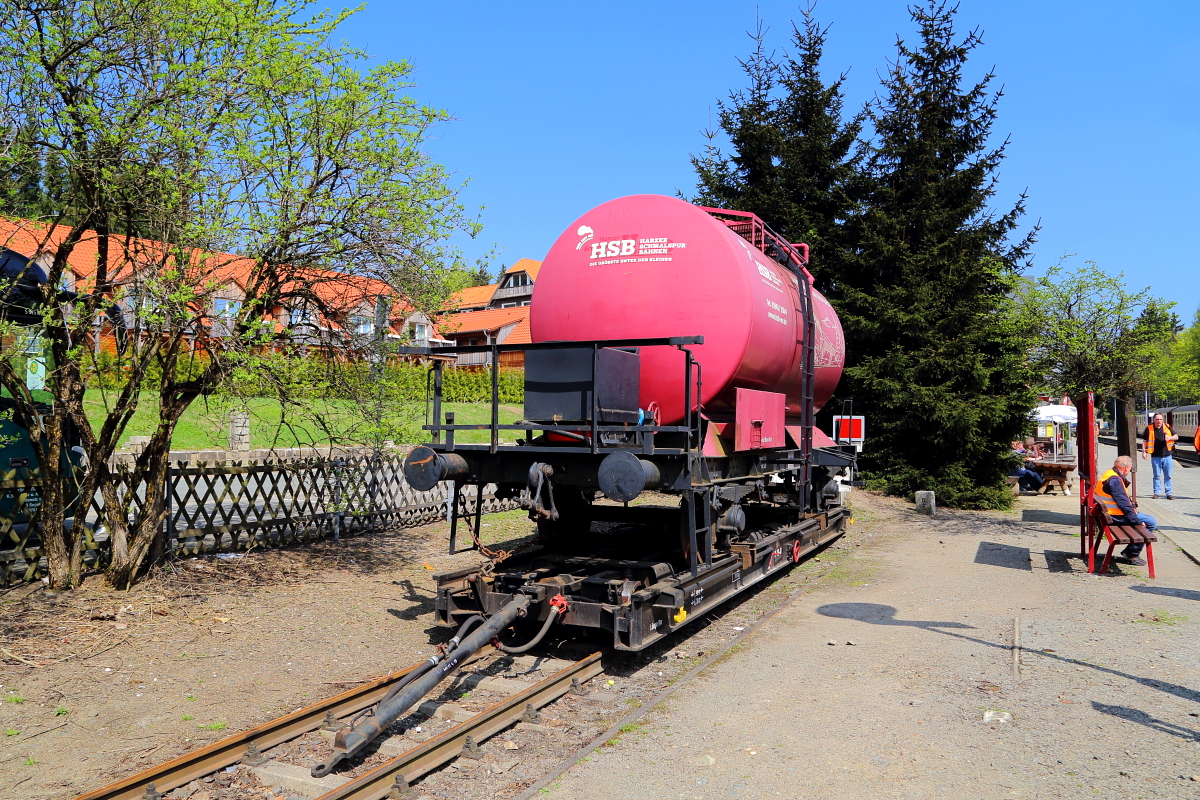 Abgestellt in dieser gemütlichen Ecke, darf der aufgebockte Kesselwagen nun die Sommersaison auf Gleis 5 im Bahnhof Drei Annen Hohne als Feuerwehr verbringen. Ein Sonder-GmP hatte ihn am 21.04.2018 hierhergebracht. Im Herbst wird er dann wieder nach Wernigerode überführt.