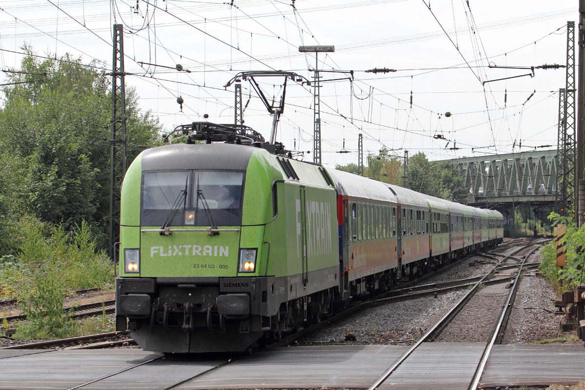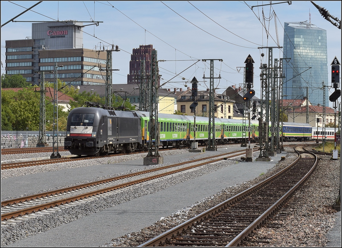 "Auch ich durfte mal Flixtrain": 182 513-2 in Frankfurt Süd mit dem Flixtrain vor der Kulisse der EZB. Juli 2018.