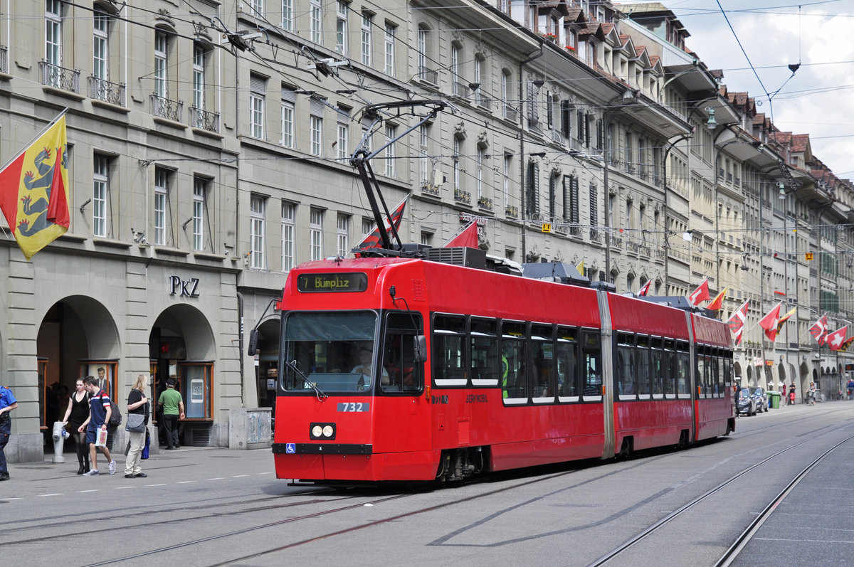 Be 4/6 Vevey Tram 732, auf der Linie 7, fährt zur Haltestelle beim Bahnhof Bern. Die Aufnahme stammt vom 22.05.2018.