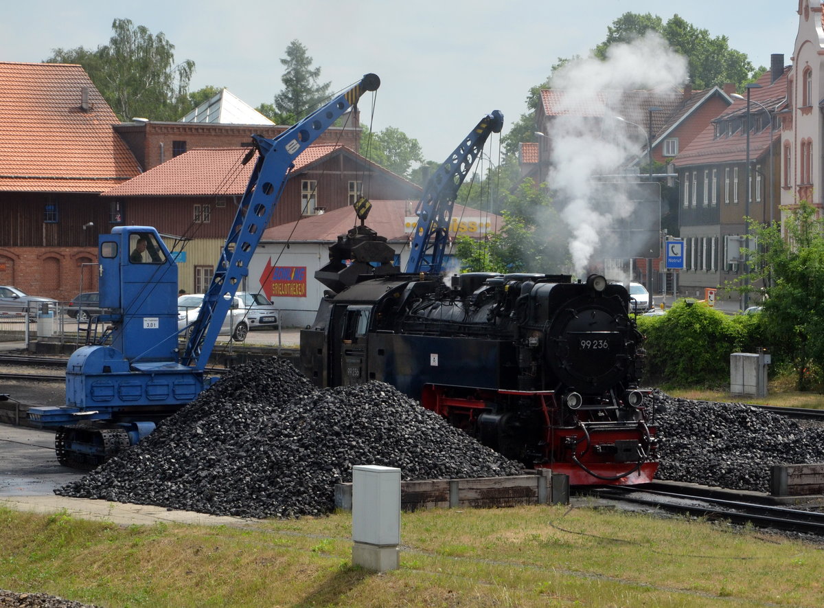 Dampflok 99 234 der Harzer Schmalspurbahn unterwegs in Wernigerode hier beim Kohle bunkern am 30.05.2018.