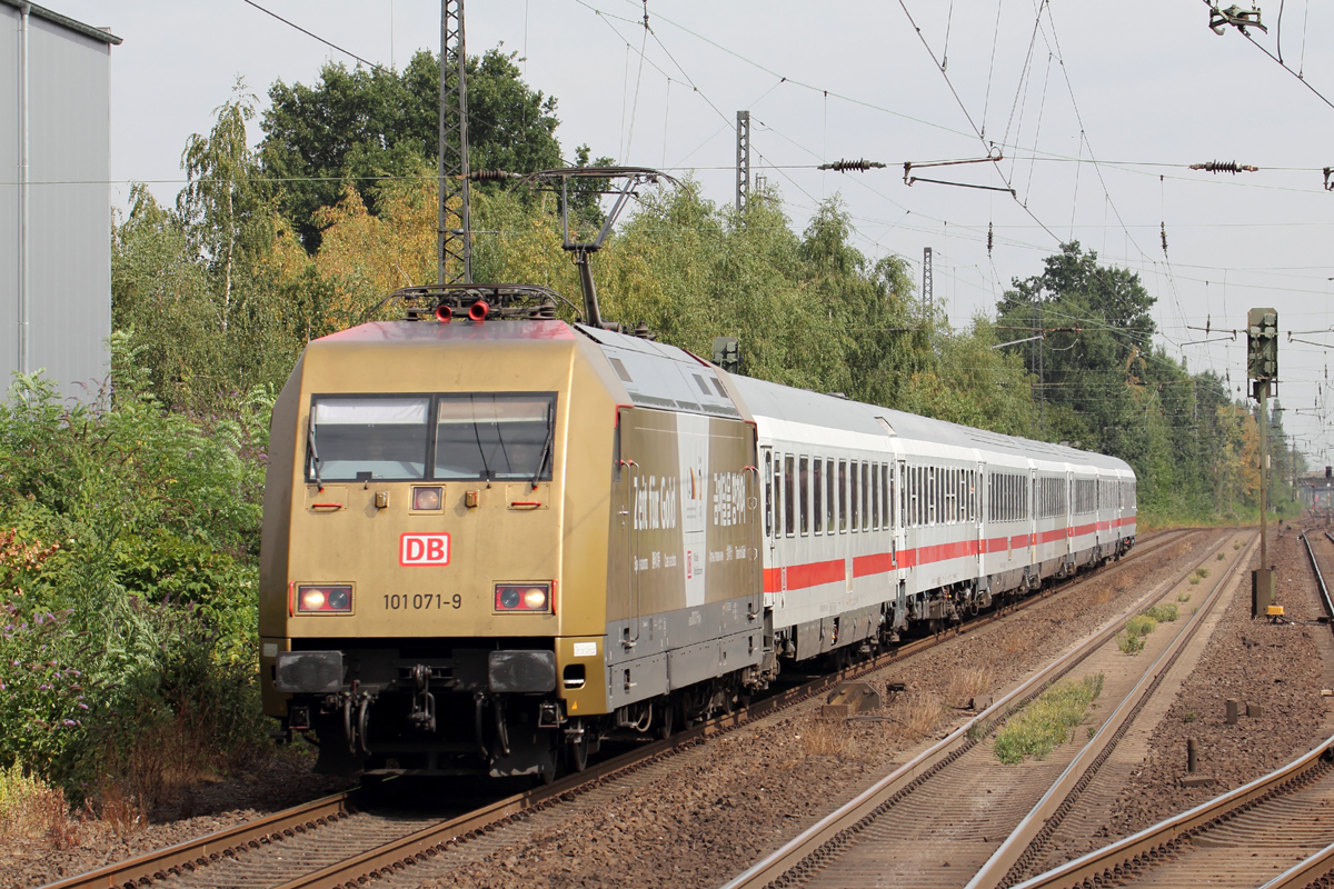 Nachschuß auf die 101 145-1 in Gubberath, als sie den Leeren IC 2223 in Depot nach Köln schiebt am Abend des 27.7.2018