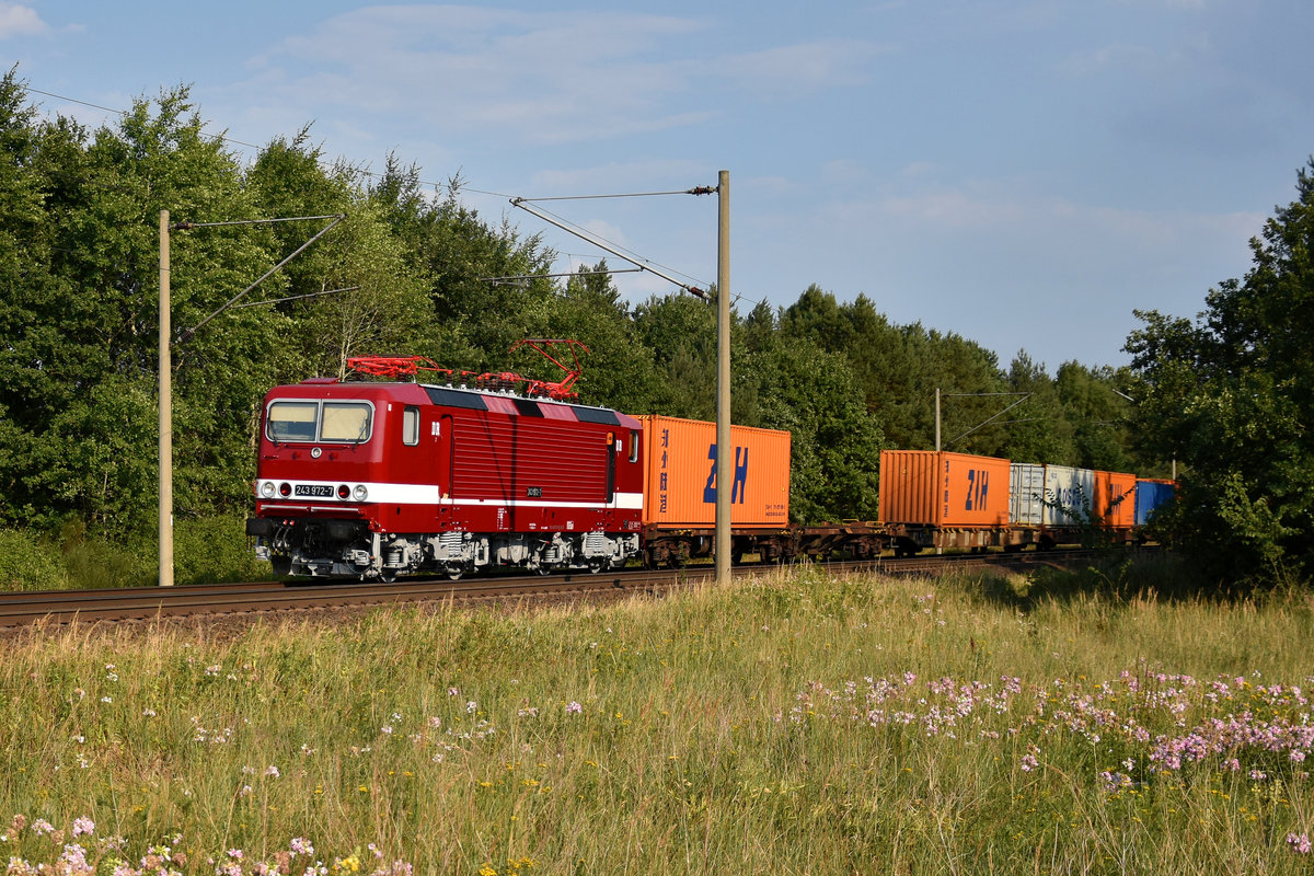 DeltaRail mit der wunderschönen 243 972-7 und einem Containerzug, kommend aus dem Hagenower Land. 3km östlich von Büchen, 26.07.2018