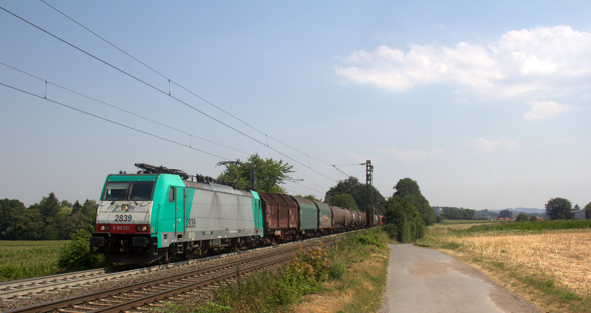Zwei belgische Cobras (E-186) sind mit ihren gemischten Güterzug am Haken nach Belgien unterwegs. Hier zu sehen an der Montzenroute unweit von Aachen am Friedrichweg. Datiert vom 31.Juli 2018