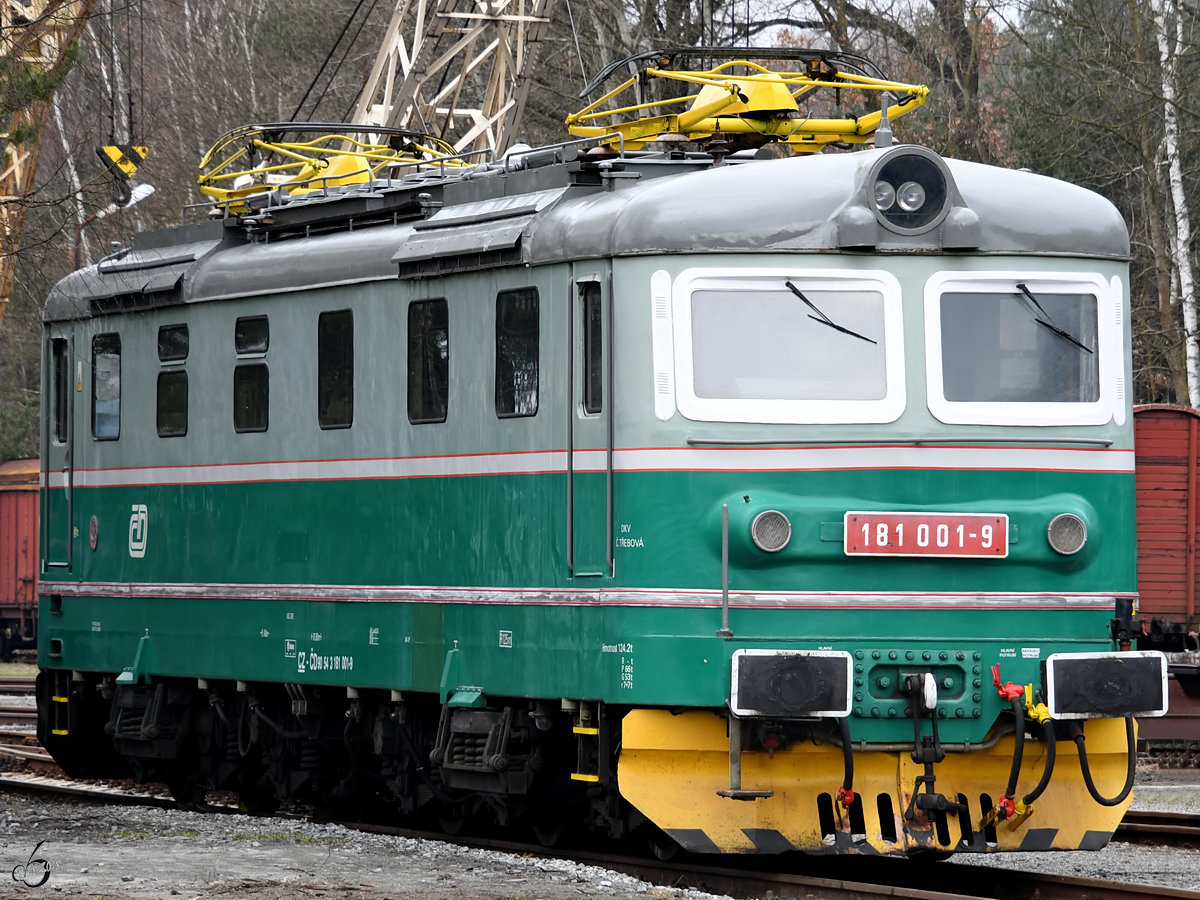 Die Elektrolokomotive 181 001-9 Anfang April 2018 im Eisenbahnmuseum Lužná u Rakovníka.