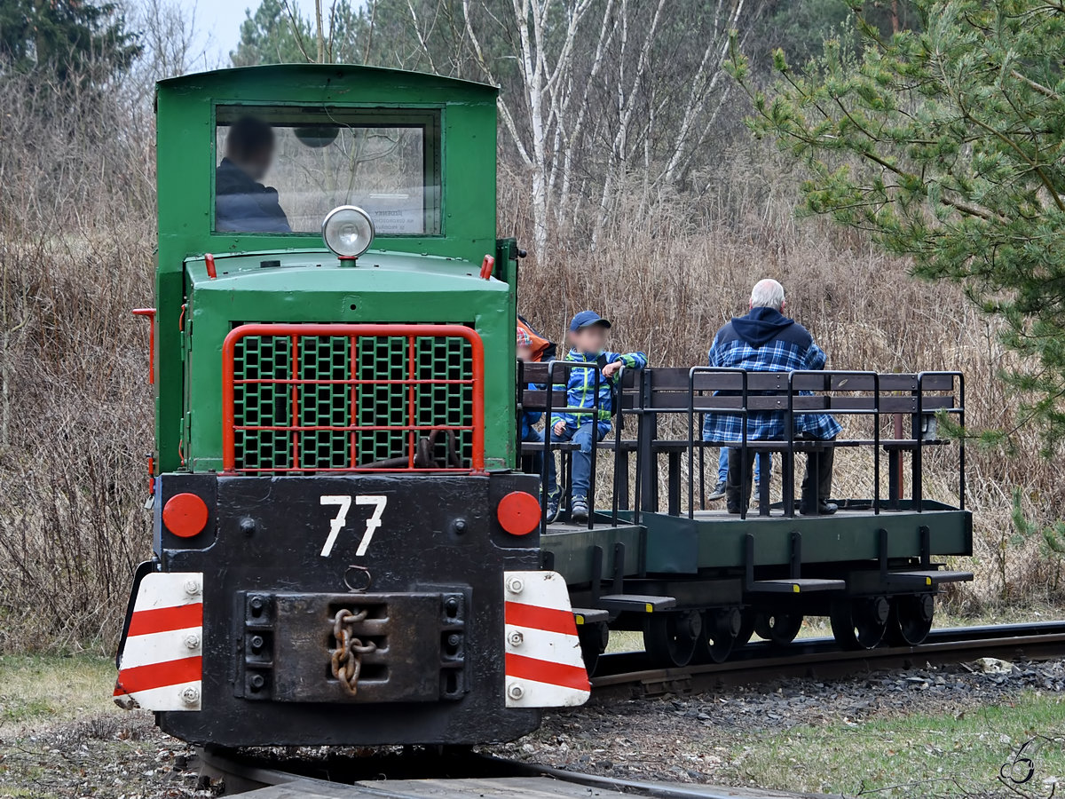 Die Feldbahnlokomotive DH 120 "77" mit einigen Fahrgästen unterwegs. (Eisenbahnmuseum Lužná u Rakovníka, April 2018)