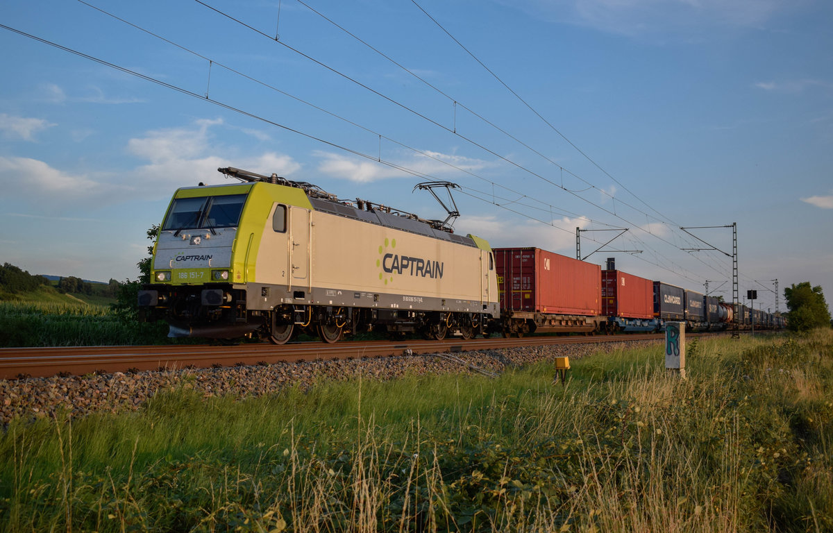Die noch ziemlich Neue 186 151 brachte im letzten Licht des 12.07.2018 einen KLV nach Rotterdam Waalhaven, aufgenommen in Buggingen.