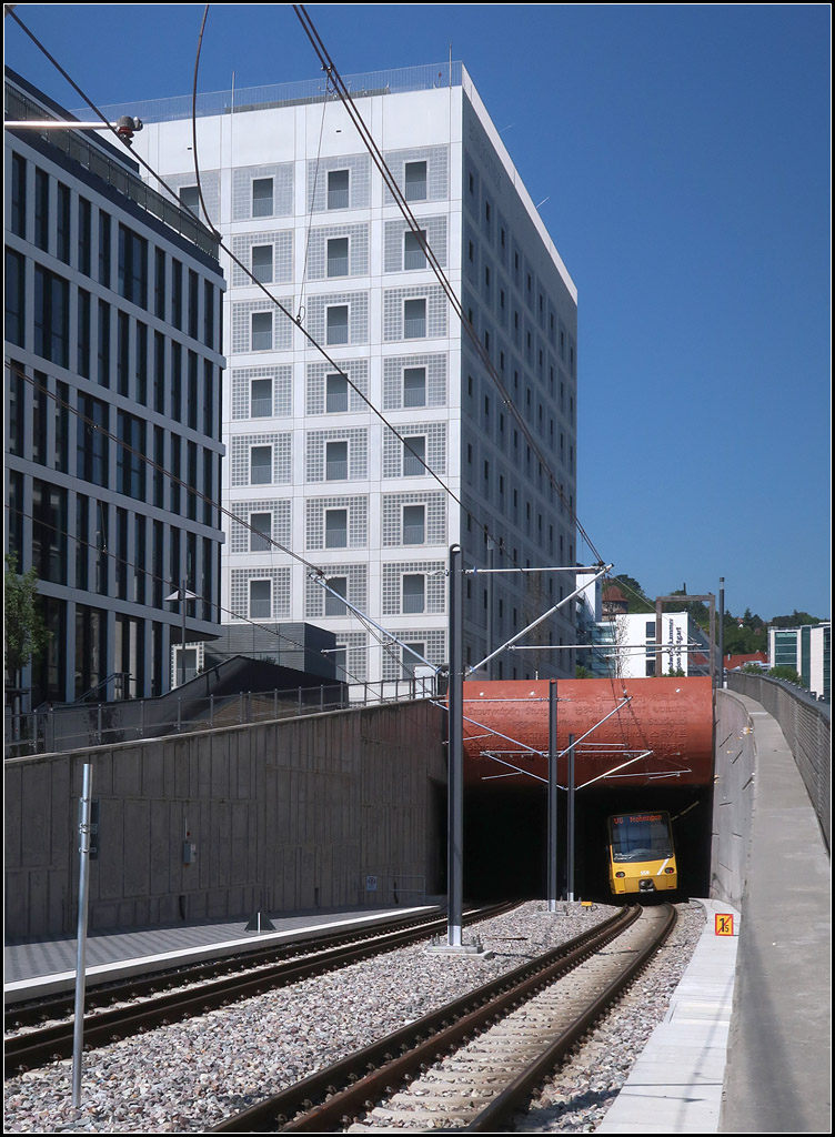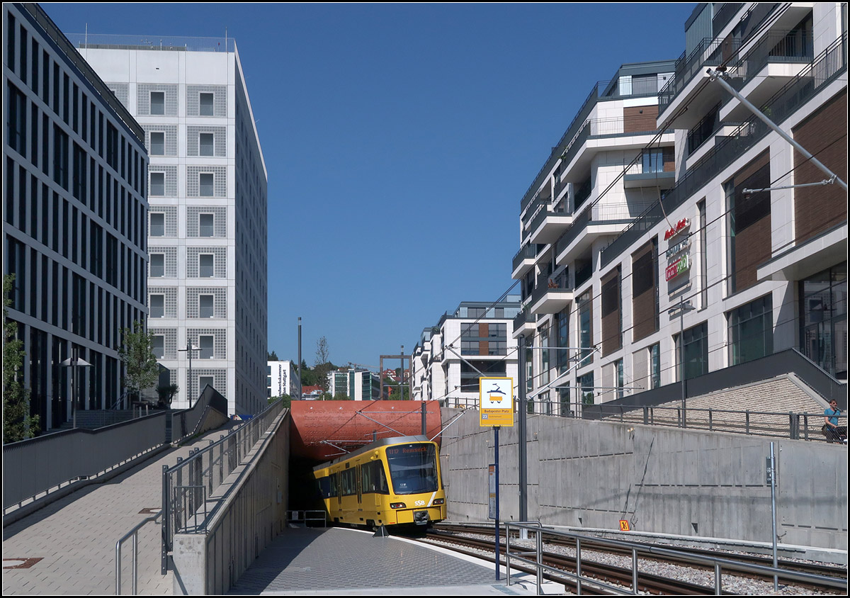 Ein Zug der Linie U12 erreicht im Stuttgart Europaviertel neben einer neuen Straßenbahnhaltestelle das Tageslicht.