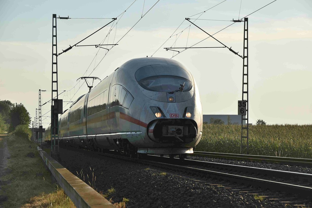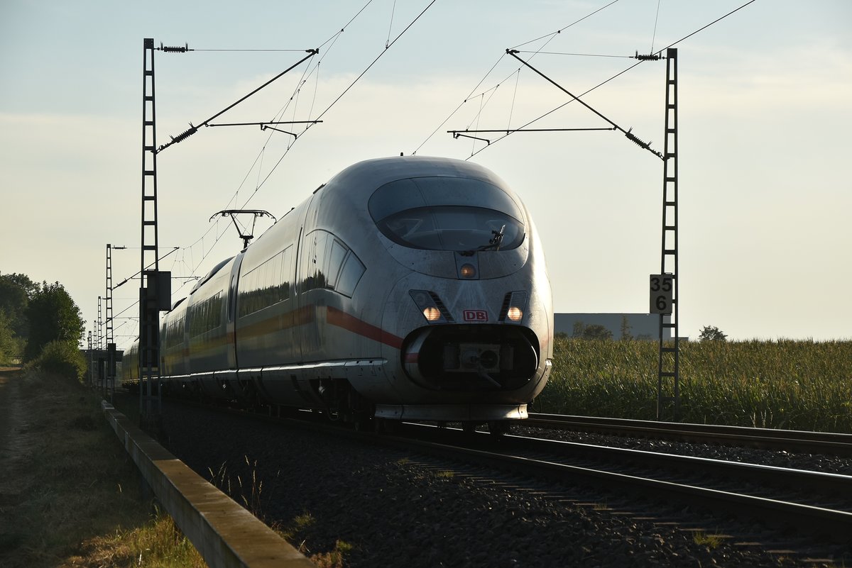 ICE 156 kommt aus Amsterdam Centraal nach Frankfurt Main Hbf bei Gubberath vor meine Linse am Abend des 27.7.2018 (Gegenlichtaufnahme)