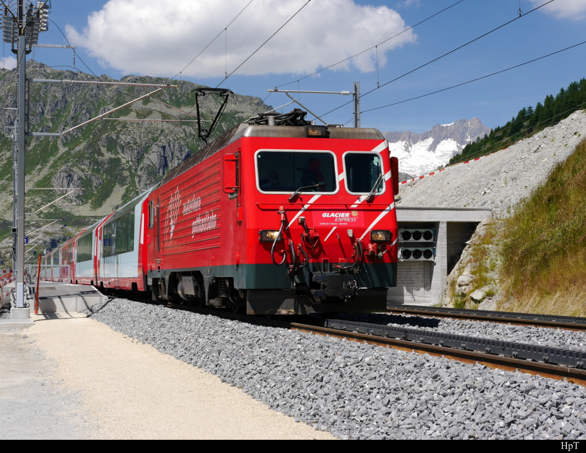 MGB - Zahnradlok HGe 4/4 103 mit Glacier Express bei der einfahrt im Bahnhof Hospenthal am 27.07.2018