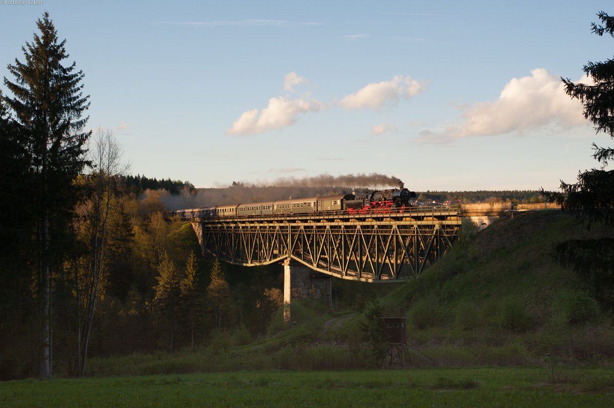 Mit einem Sonderzug aus Loket (Böhmen) zieht 52 8195 bei Neusorg ihren Zug übers Fichtelnaabviadukt in Richtung Mittelfranken Metropole Nürnberg, 13.05.17
