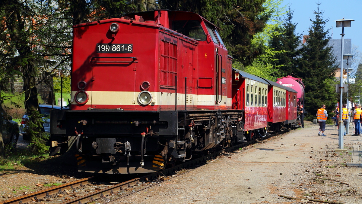 Nach dem Abkuppeln des Rollwagens zieht 199 861, geführt vom Lokführer über "Playstation", ihren Sonderzug im Bahnhof Drei Annen Hohne nun wieder aus Gleis 5, um ihn auf Gleis 3 zur Weiterfahrt nach Wernigerode zu rangieren.
