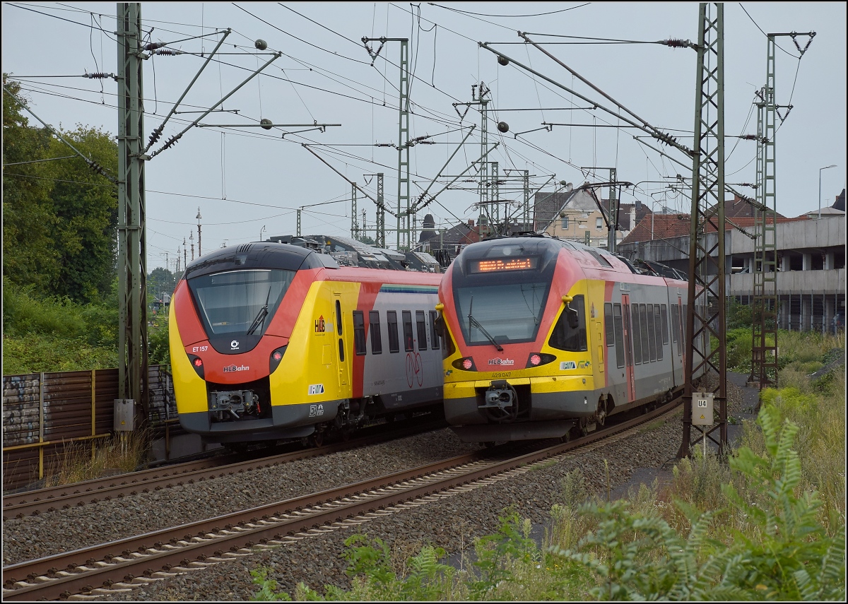 Paralleleinfahrt der HLB nach Friedberg mit Coradia Continental 1440 157-4 und einem Dreierpack Flirt, am Zugende 429 047. Juli 2018.