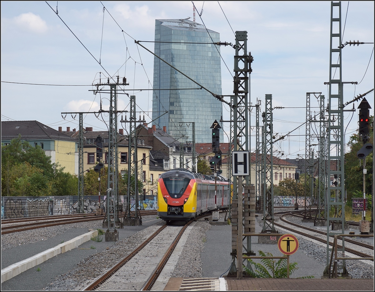 Tags zuvor war der erste Einsatz des Coradia Continental der HLB im Regelbetrieb - hier 1 440 157 auf der RB 58. Frankfurt Süd, Juli 2018.