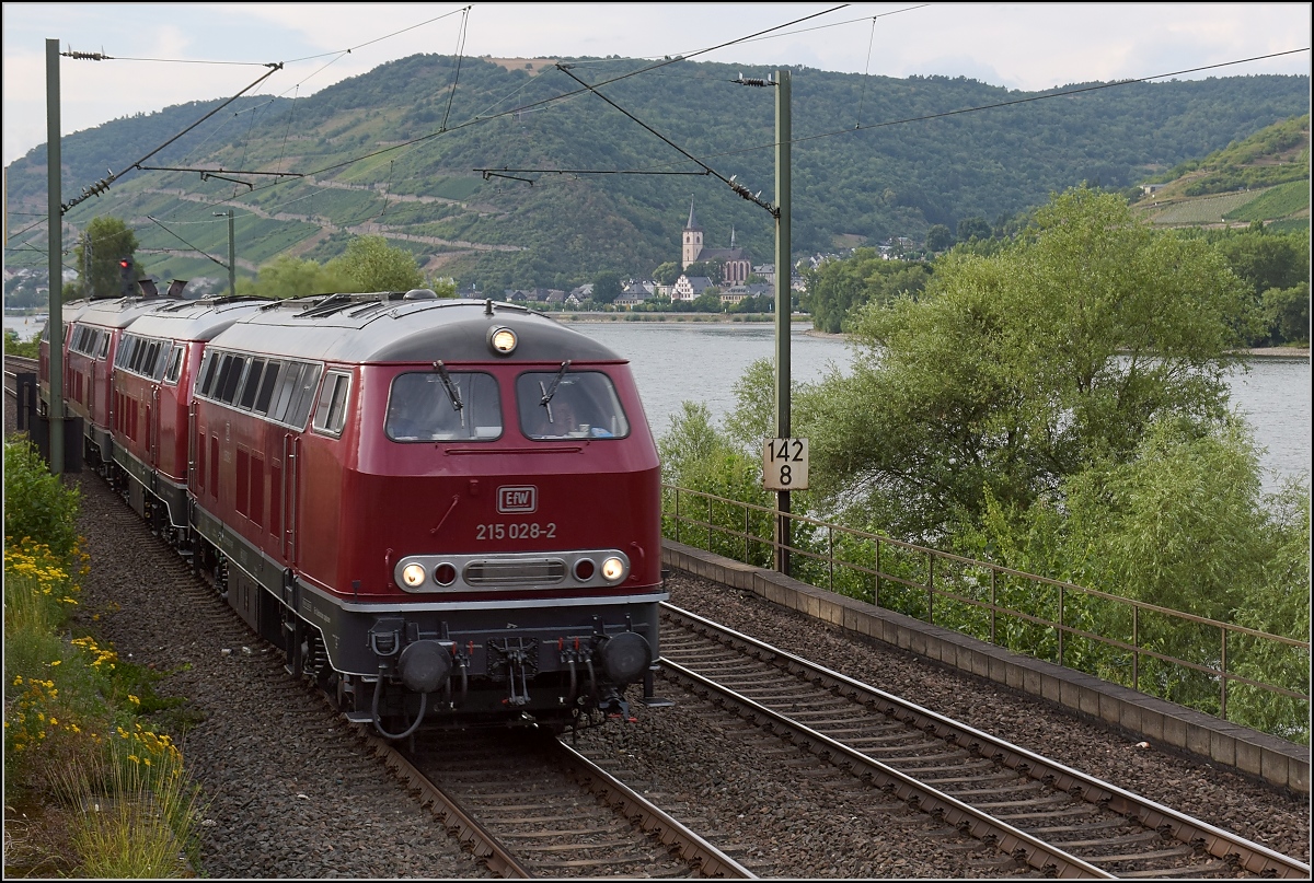 Überraschung in Niederheimbach. 4 altrote EfW-Loks der V160 Familie am Stück romantisch verpackt am Rhein. Führend 215 028-2, am Ende 215 025-8, dazwischen wohl eine 218? Juli 2018.