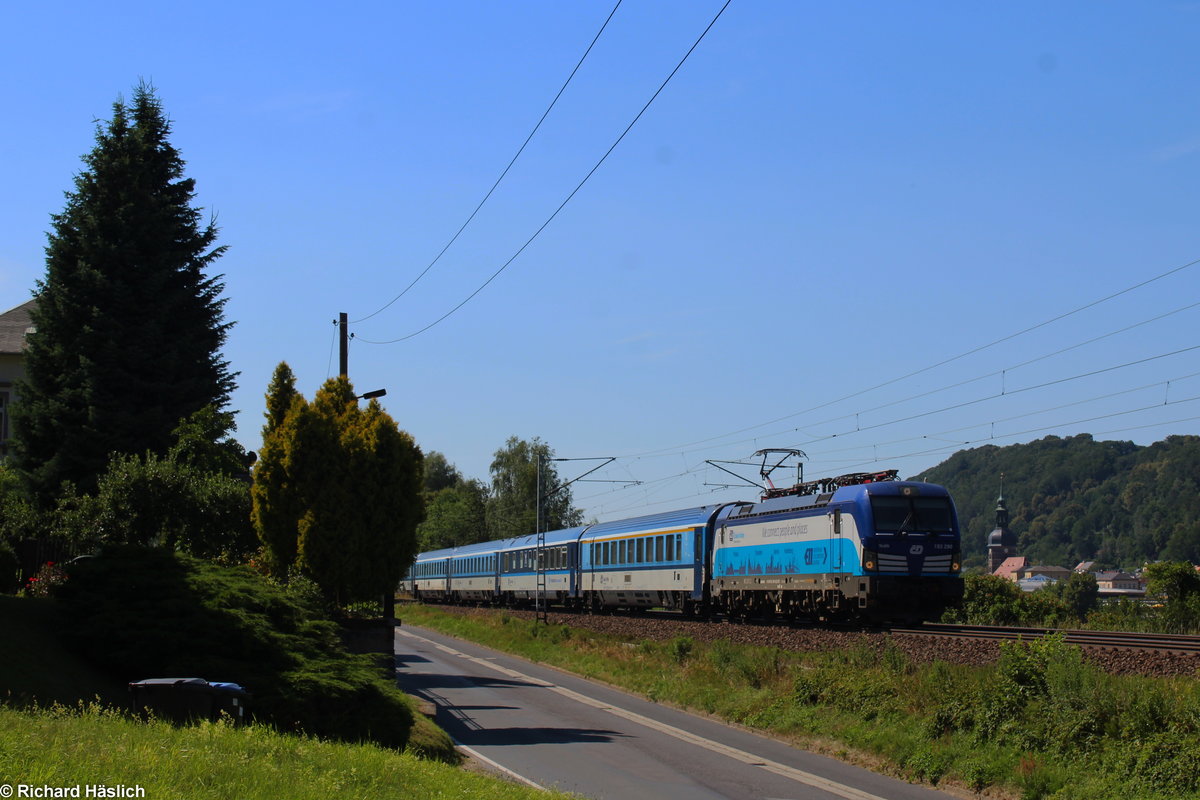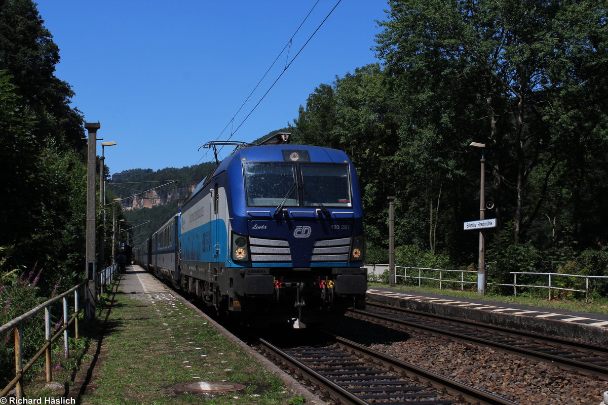 193 291 alias "Linda" zieht einen Euro City durch Schmilka-Hirschmühle nach Tschechien.