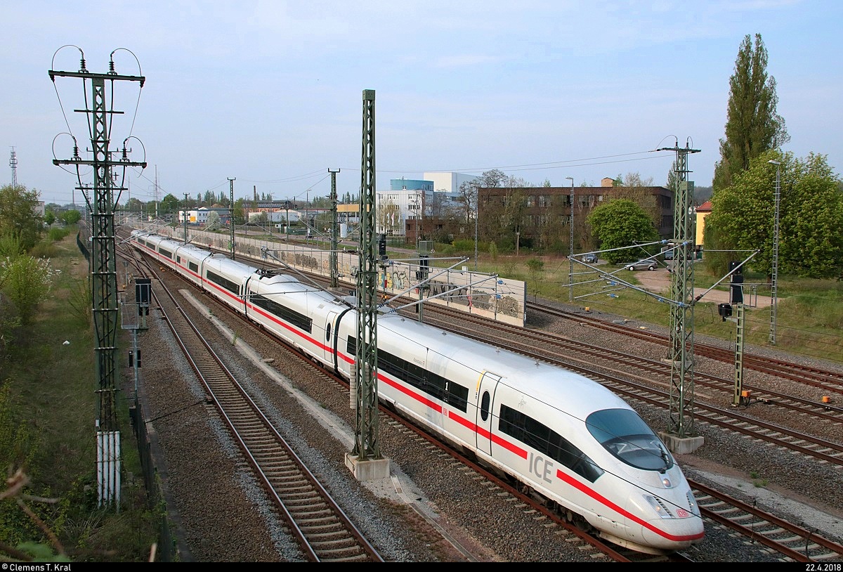 403 535 (Tz 335 "Konstanz") als ICE 1536 (Linie 15) von Berlin Gesundbrunnen nach Frankfurt(Main)Hbf fährt in Halle-Ammendorf auf der Neubaustrecke Erfurt–Leipzig/Halle (KBS 580). Aufgenommen von der Brücke Hohe Straße. [22.4.2018 | 18:21 Uhr]
