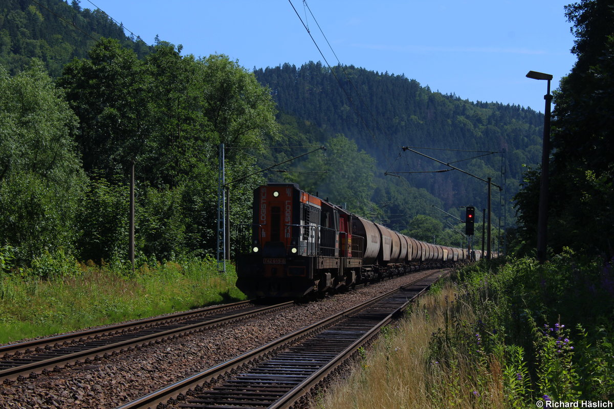 742 625-8 und eine Schwesterlok ziehen einen Güterzug durch Schmilka-Hirschmühle und wird in Bad Schandau Ost den Zug gleich verlassen und leer wieder nach Tschechien fahren.