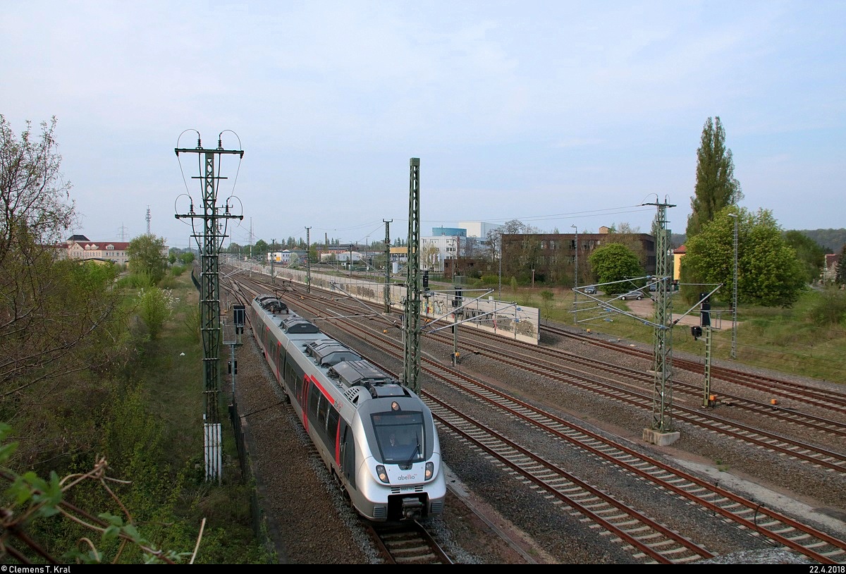 9442 101 (Bombardier Talent 2) von Abellio Rail Mitteldeutschland als RB 74830 (RB20) von Halle(Saale)Hbf nach Weißenfels fährt in Halle-Ammendorf auf der Bahnstrecke Halle–Bebra (KBS 580). Aufgenommen von der Brücke Hohe Straße. [22.4.2018 | 18:27 Uhr]