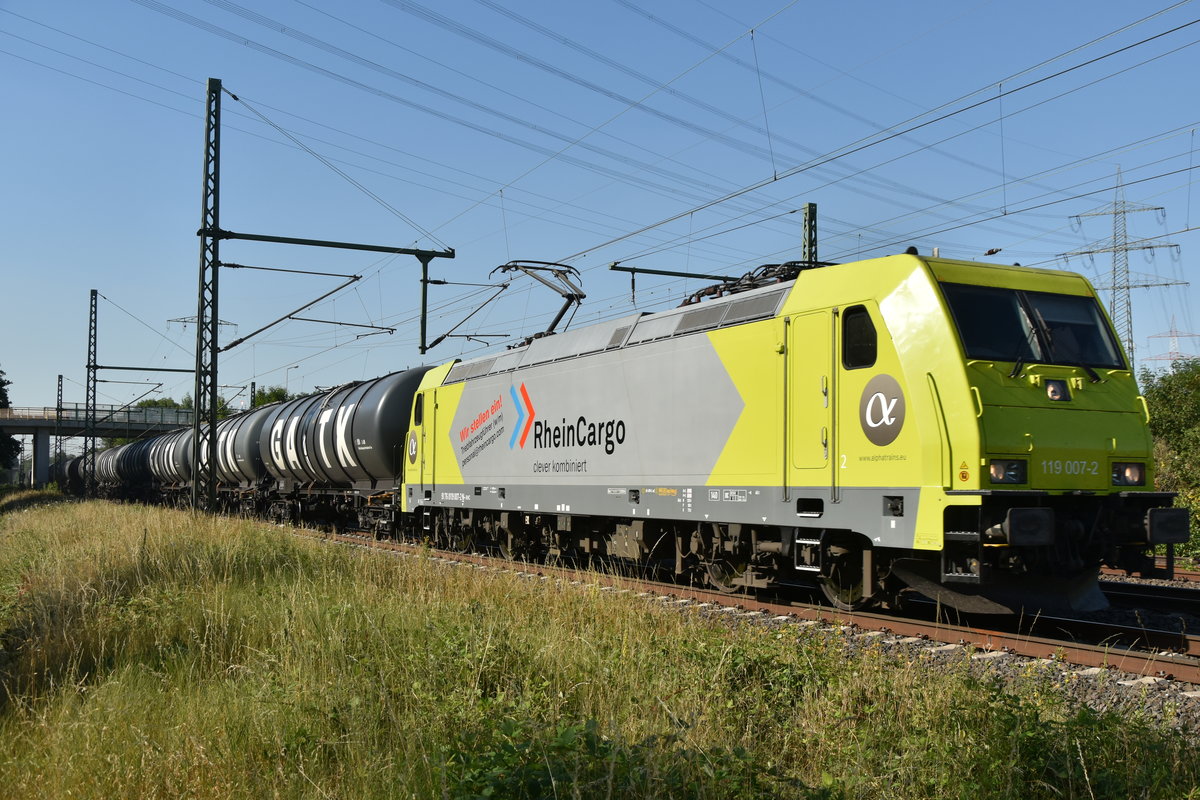 Alfatrain 119 007-2 für RheinCargo mit einem Kesselwagenzug durch Lintorf gen Ratingen am Dienstag den 3.7.2018