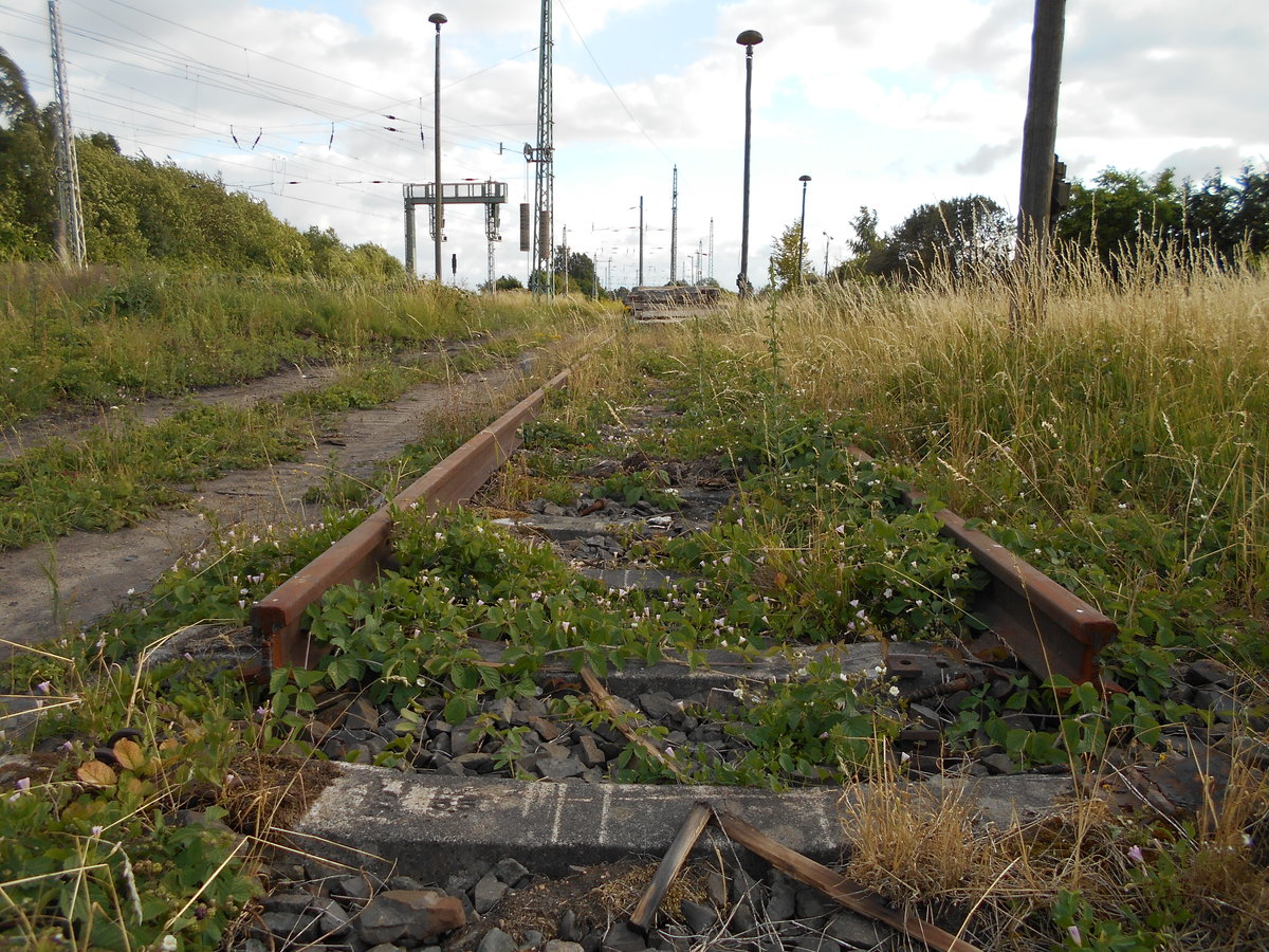 Auch in Bergen/Rügen sind zum Teil ehemalige Gleisreste zufinden,die man nicht entfernt hat.Dieser abgeklemmte Gleisrest gehörte zur ehemaligen Anschlußbahn.Aufnahme am 23.Juni 2018.