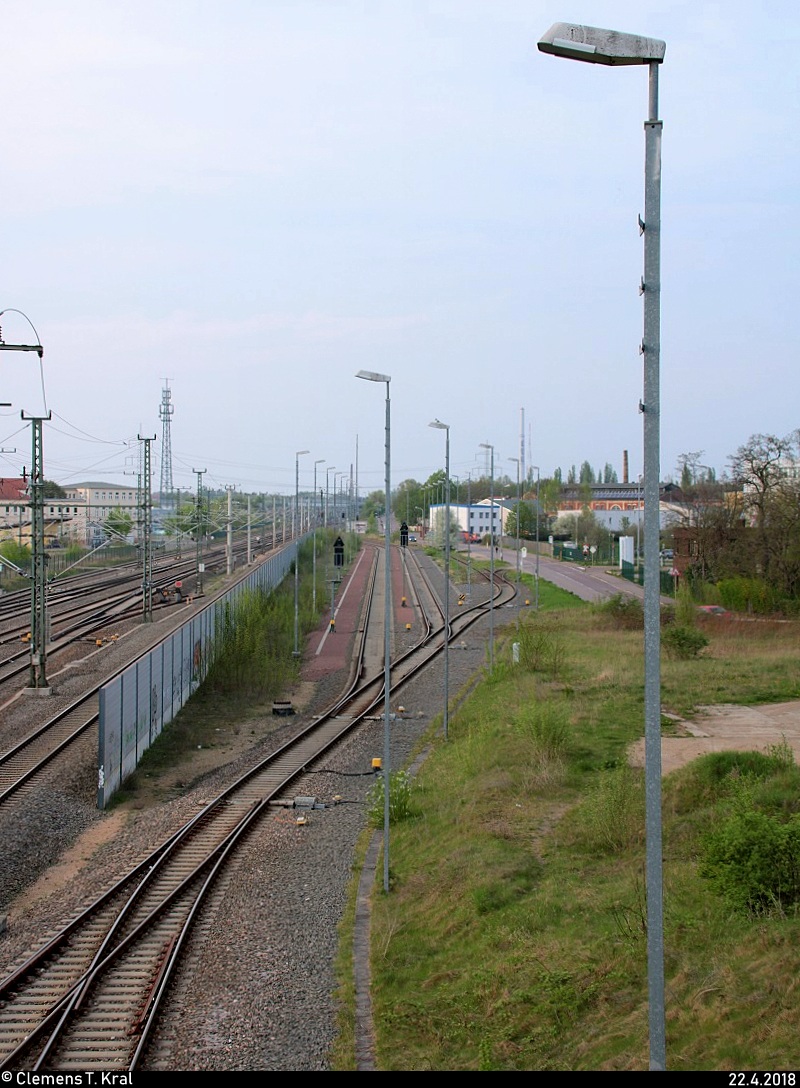 Blick auf die Anschlussgleise zur MSG Maschinenbau und Service GmbH in Halle-Ammendorf (früher Waggonbau Halle-Ammendorf). Aufgenommen von der Brücke Hohe Straße. [22.4.2018 | 18:24 Uhr]
