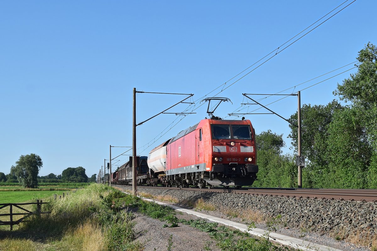 155 097-9 durchquert mit einem gemischten Güterzug den Hasseler Forst bei Düsseldorf in Richtung Bahnhof Eller am Nachmittag des 27.6.2018
