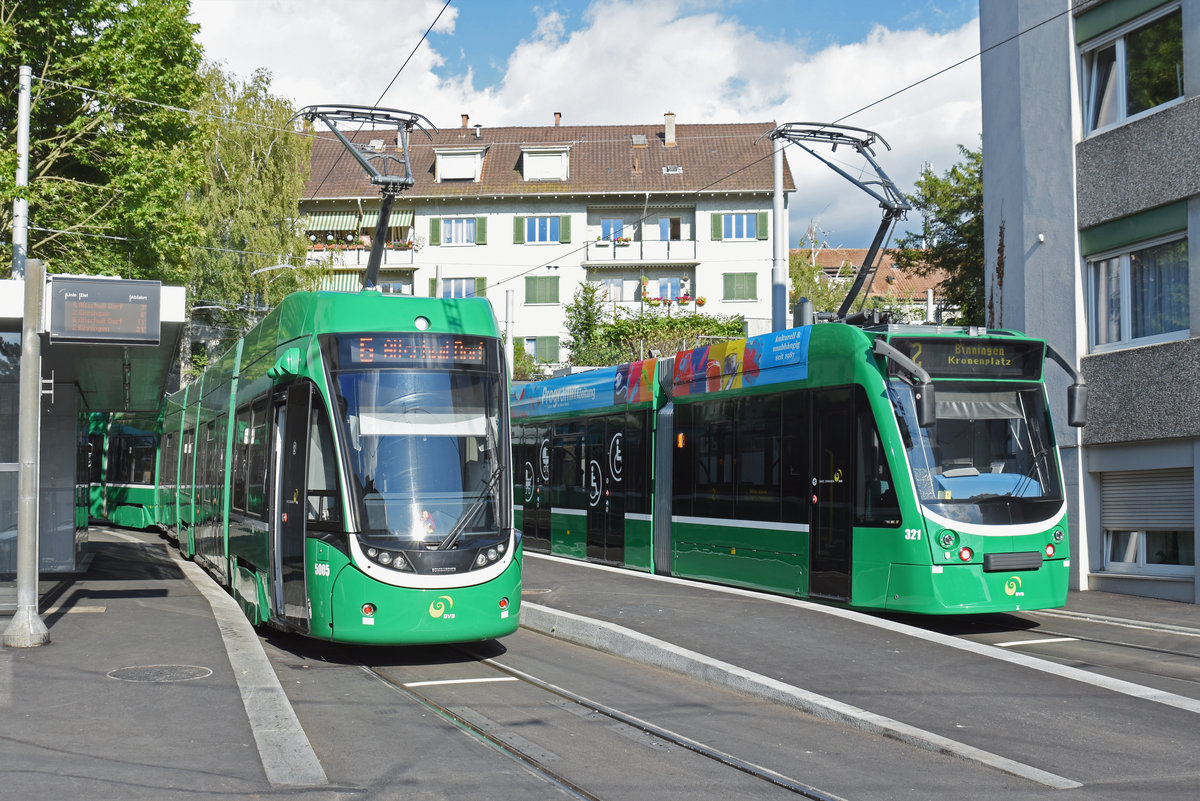 Die beiden Be 6/8 Flexity 5005, auf der Linie 6, und der Combino 321, auf der Linie 2, warten in der Schlaufe an der Riehen Grenze die nächste Abfahrtszeit ab. Die Aufnahme stammt vom 26.06.2018.