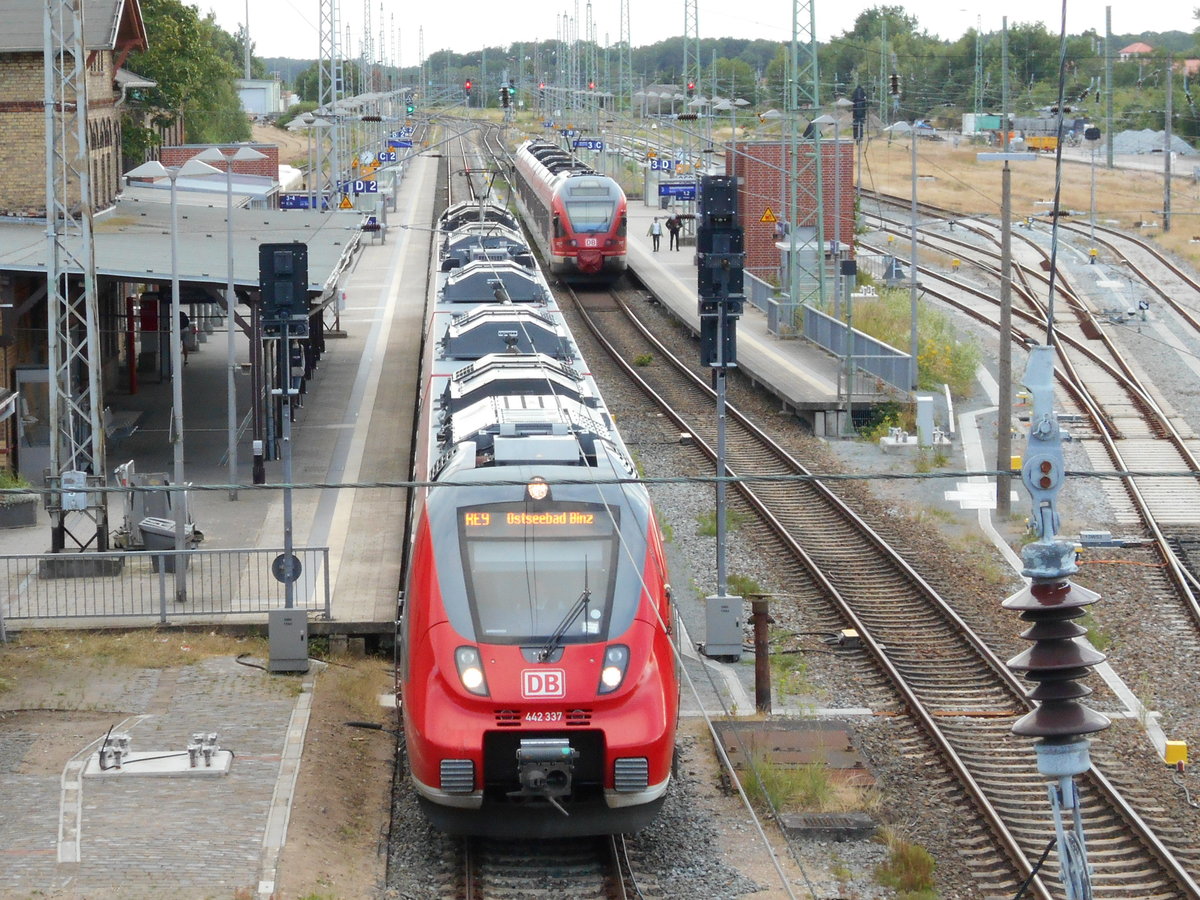 Drei Züge zur gleichen Zeit,am Abend,am 23.Juni 2018,in Bergen/Rügen:442 337 als RE Stralsund-Binz,429 030 als RE Sassnitz-Rostock und nach Suchen,etwas versteckt,der PRESS VT650 032 nach Lauterbach Mole.Aufnahme von der Fussgängerbrücke aus.