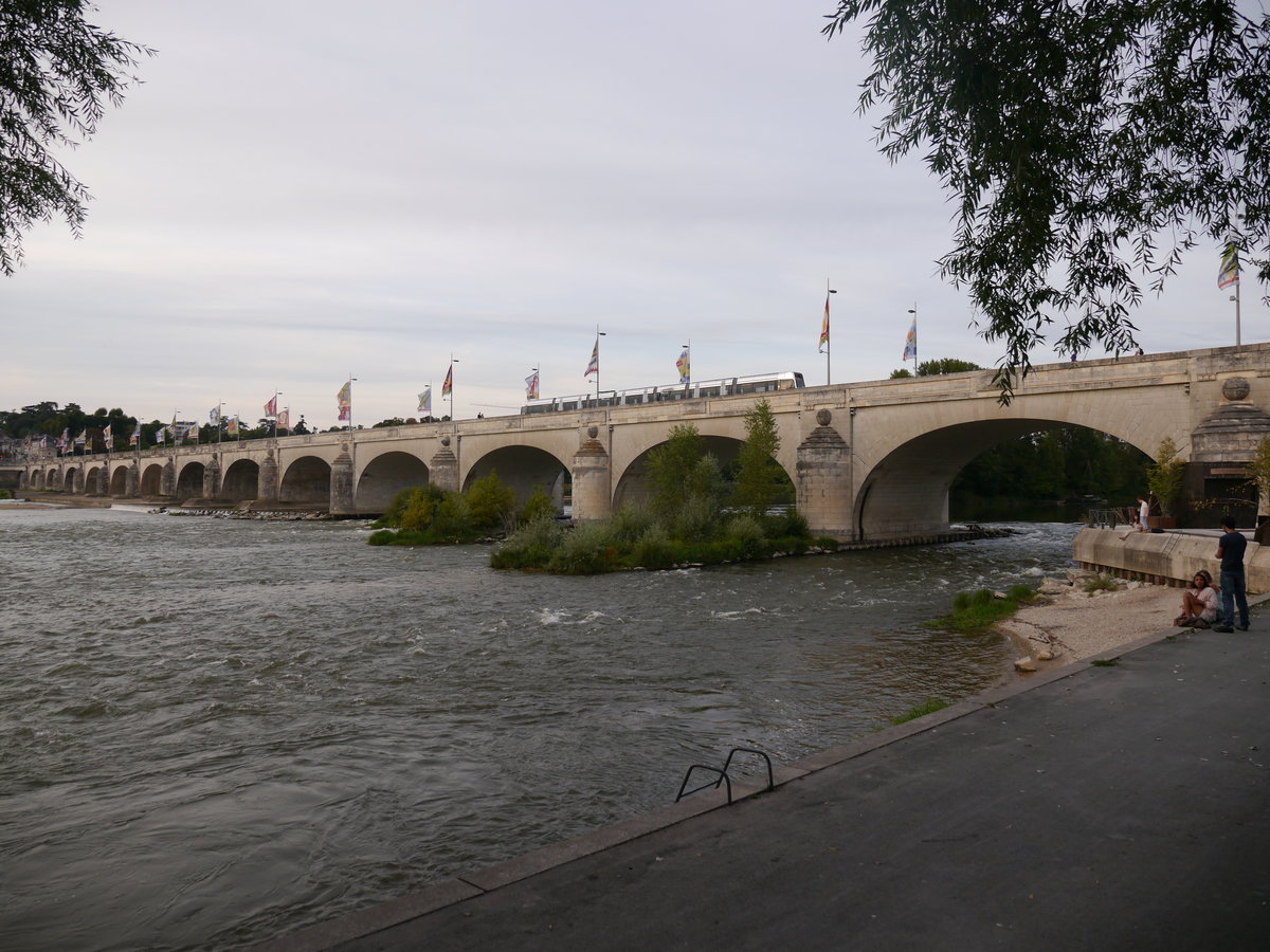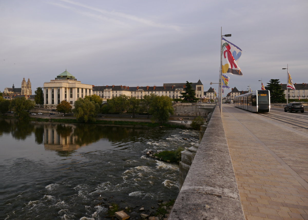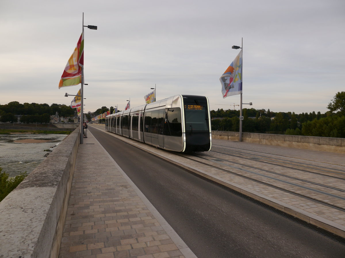 Eine FilBleu-Tram überquert auf der Pont-Wilson die hier doch schon recht breite Loire Richtung Innenstadt. Die am 31. August 2013 eröffnete Tram in Tours wird mit Straßenbahnen des Typs Alstom Citadis 402 befahren, die hier auf Wunsch der Stadt eine sehr markante und ungewöhnliche Front haben. 2014-09-16 Tours Pont-Wilson
