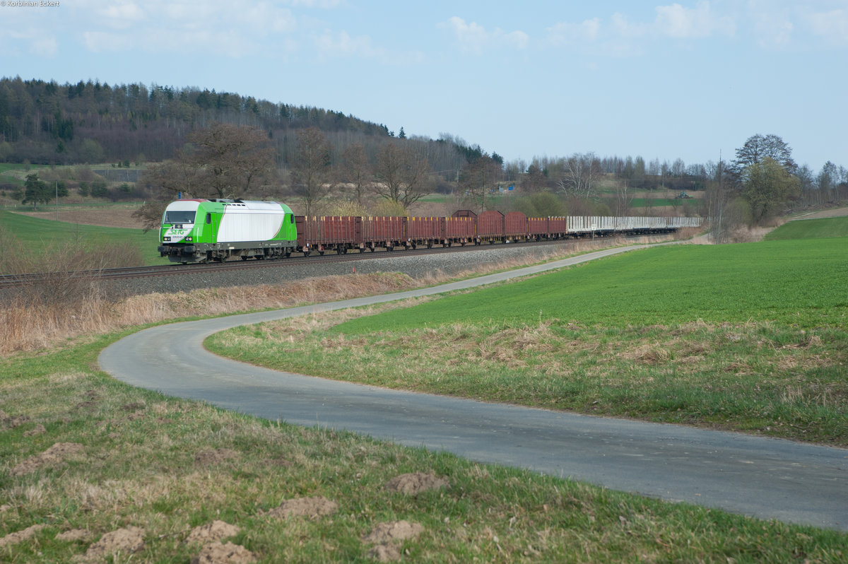 ER20-01 der SETG mit einem leeren Holzzug von Wiesau (Oberpf) nach Cheb bei Lengenfeld, 01.04.2017