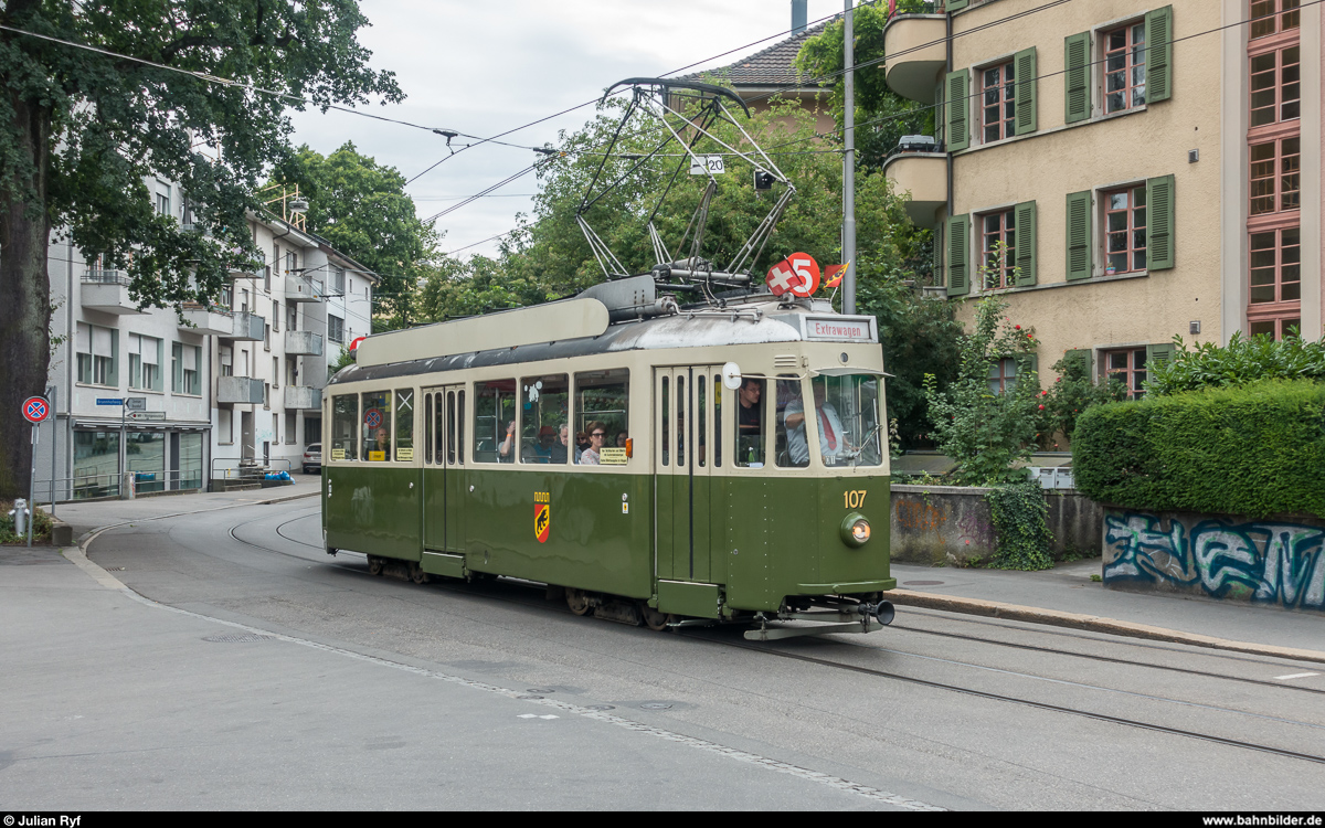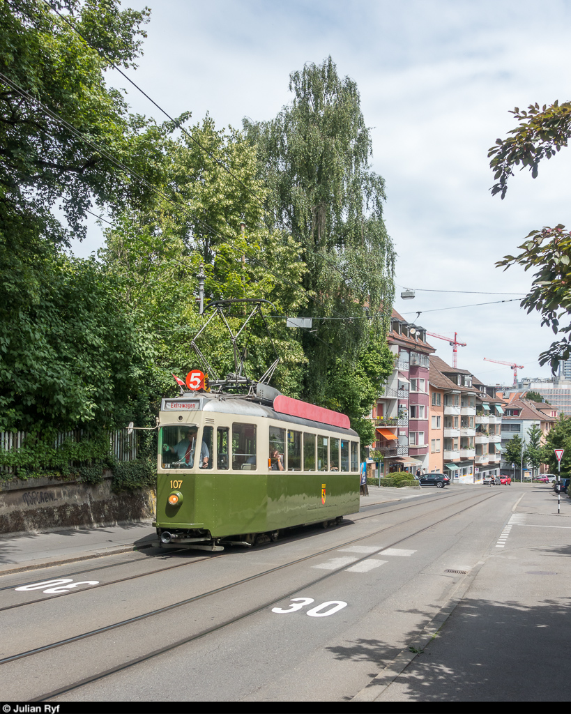 Standardtram Ce 4/4 107 zwischen Cäcilienstrasse und Brunnhof auf dem steilsten Abschnitt des Berner Tramnetzes.