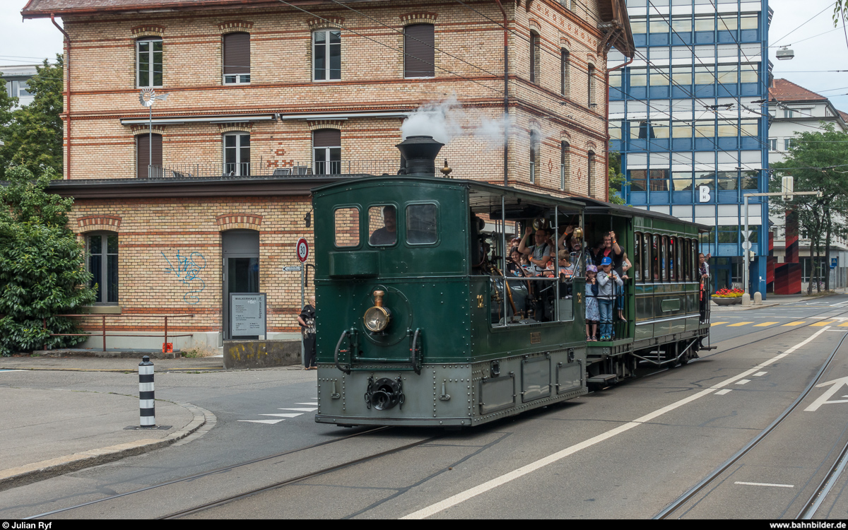Lok 42 der Bahnbaugruppe kommt mit einem Manschaftswagen durch Lintorf gen Entenfang gefahren am Dienstag den 3.7.2018