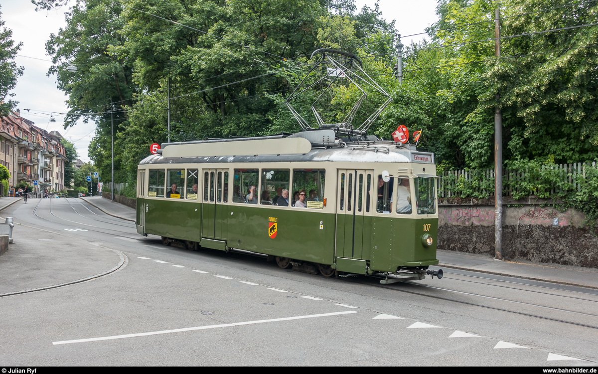 Ce 4/4 107 zwischen Brunnhof und Cäcilienstrasse auf dem steilsten Abschnitt des Berner Tramnetzes.