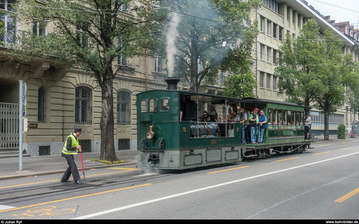 Dampftram G 3/3 12 in der Bundesgasse. Der Zugbegleiter stellt die Weiche.