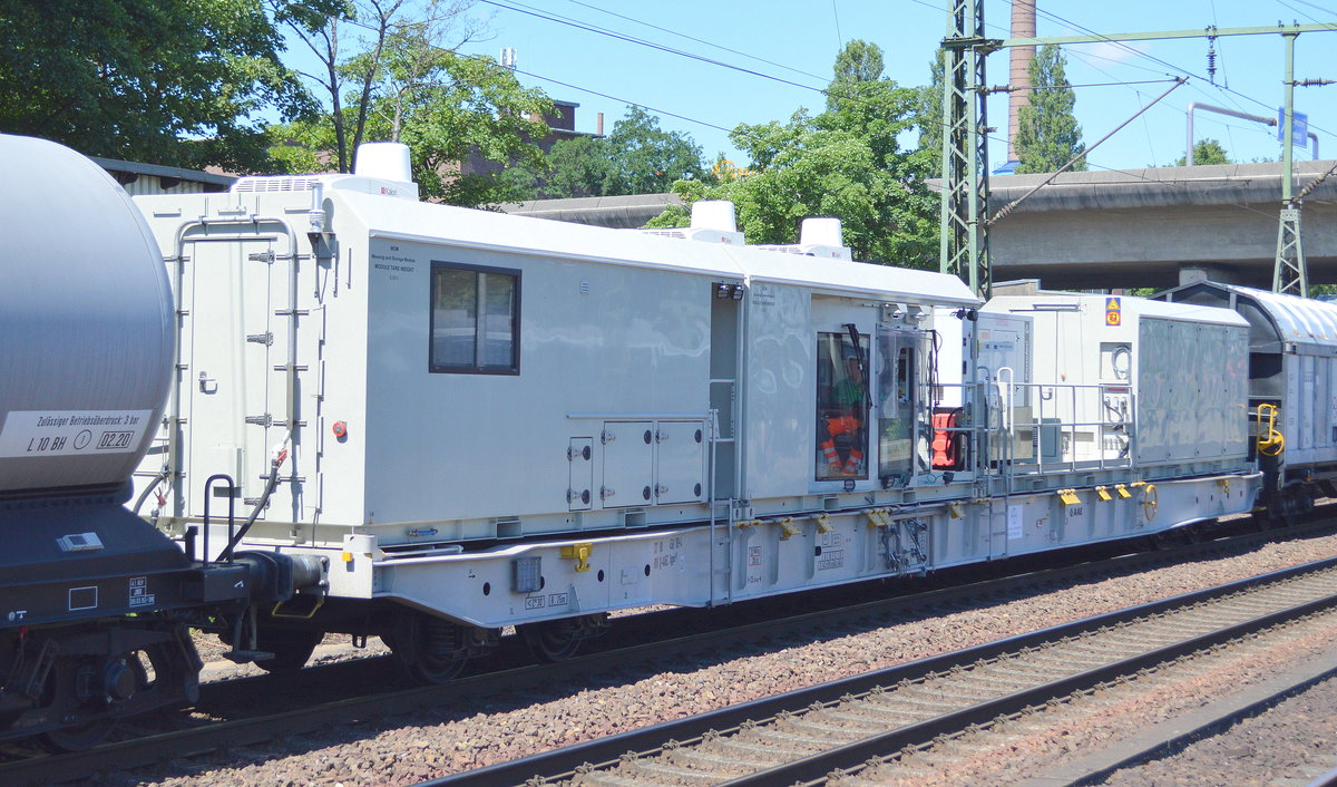 Hinter DM 100.2 gereiht ein Niederflurwagen der den "Menzi Muck" transportiert.