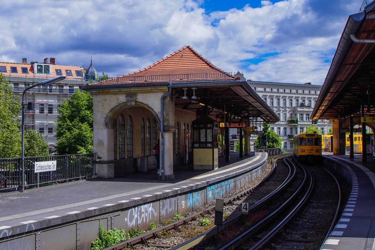 Der Hochbahnhof "Schlesisches Tor" befindet sich über einem kleinen Platz , unweit der Oberbaumbrücke in Berlin im Ortsteil Kreuzberg. In den kleinen Häuschen mussten früher die Zugabfertiger die Züge abfertigen.