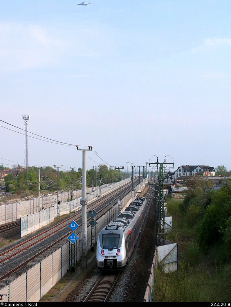 Unter der Antonov An 124 ereignet sich ein Nachschuss auf 9442 308 (Bombardier Talent 2) von Abellio Rail Mitteldeutschland als RE 74570 (RE16) von Halle(Saale)Hbf nach Erfurt Hbf, der in Halle-Ammendorf auf der Bahnstrecke Halle–Bebra (KBS 580) fährt. Aufgenommen von der Brücke Hohe Straße. [22.4.2018 | 18:12 Uhr]