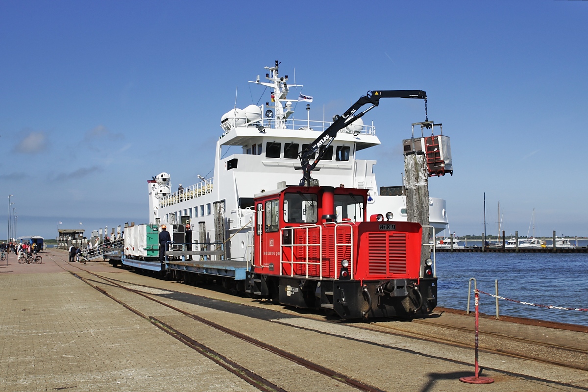 Während die meisten Fahrgäste zum im Hintergrund sichtbaren Zug der Inselbahn Wangerooge streben, zieht es den Eisenbahnfotografen in die entgegengesetzte Richtung, um das Abladen der Container mit dem Urlaubergepäck von der Wangerooge IV auf die Flachwagen aufzunehmen. Erst wenn der Umladevorgang abgeschlossen und 399 107-2 die Wagen an das Zugende geschoben hat, wird sie sich vor den Zug setzen und die Reisenden zum Inselbahnhof bringen.