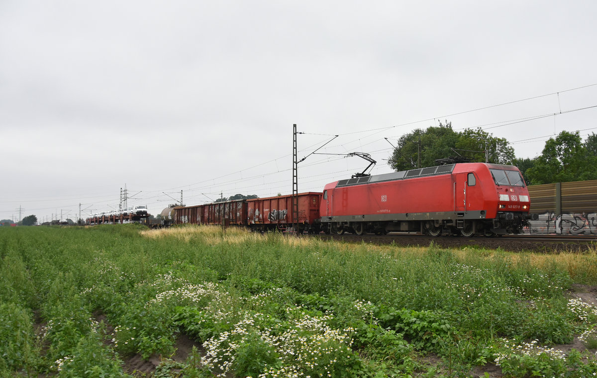 145 027-9 mit einem gemischten Güterzug kommend aus Lüneburg. Höhe Bardowick, 26.06.2018.