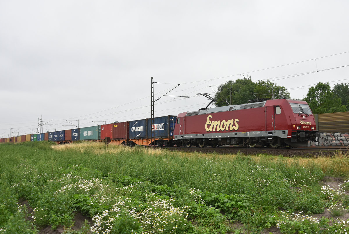 185 632-7 der Emons Rail Cargo unterwegs mit Container in Richtung Hamburg. Höhe Bardowick, 26.06.2018.