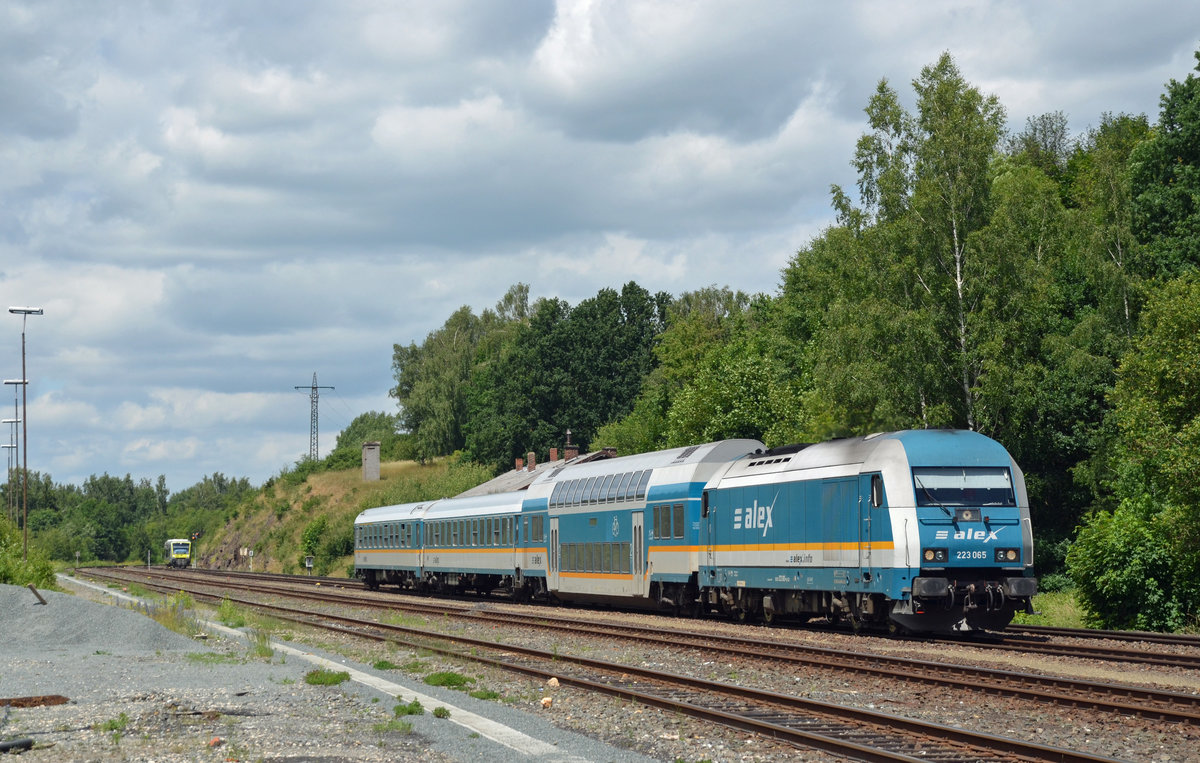 223 065 bespannte am 18.06.18 einen Alex von Hof nach München, welchen sie bis Regensburg bringen wird. Hier passiert der Zug Oberkotzau; im HIntergrund folgt auf dem hinteren Gleis bereits ein agilis-Triebwagen nach Selb Stadt.