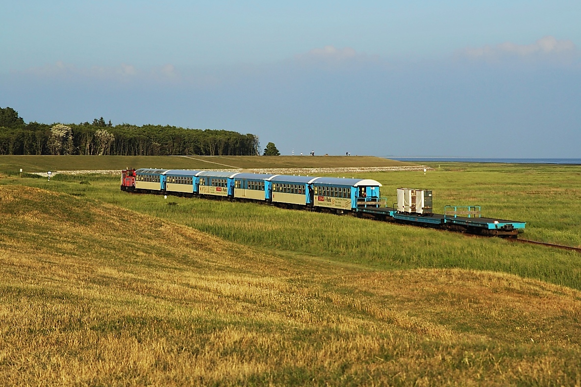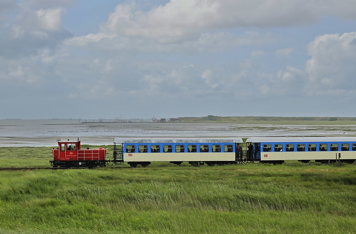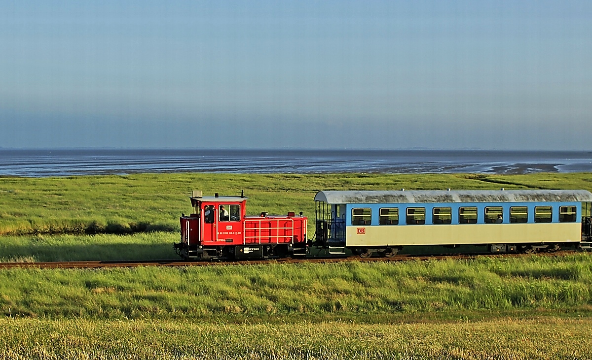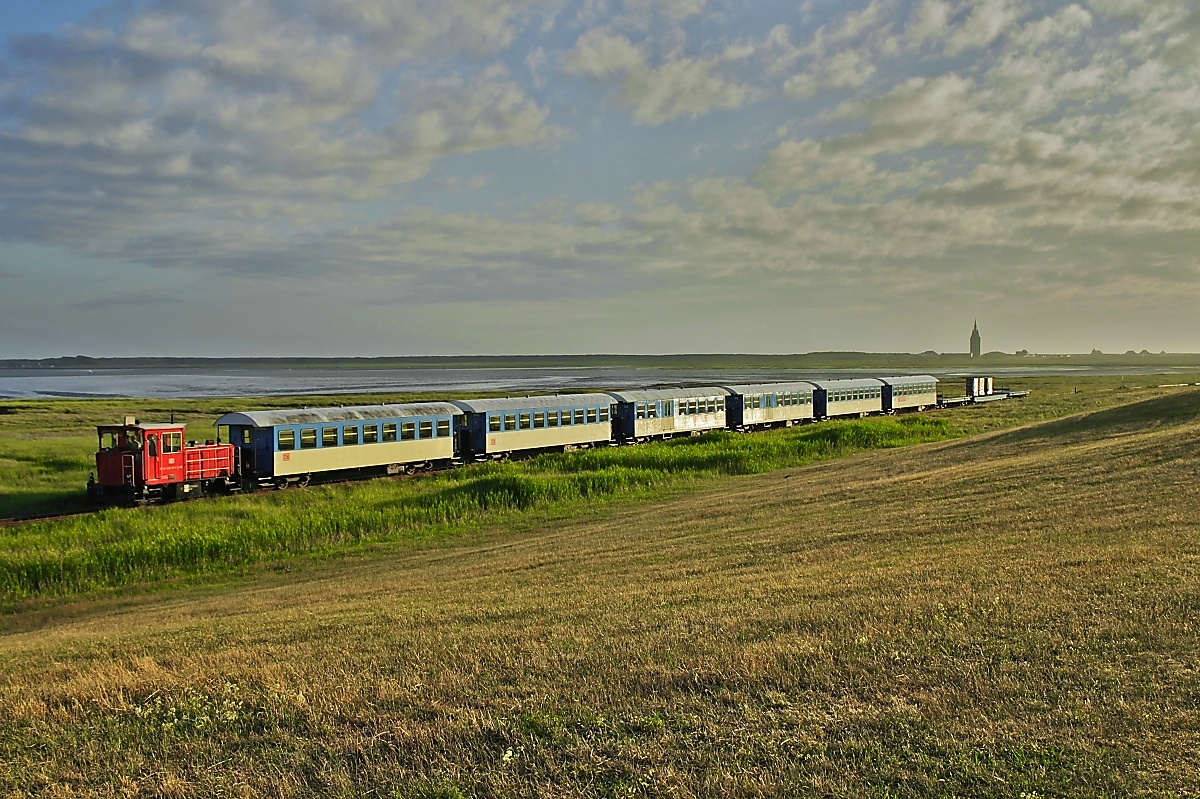 An einem der längsten Tage des Jahres, dem 20.06.2018, ist 399 108-0 mit dem abendlichen Zug vom Anleger in Richtung Wangerooge Ort unterwegs. Gerade rechtzeitig rissen die Wolken auf, so dass der Zug von der langsam untergehenden Sonne angestrahlt wurde.