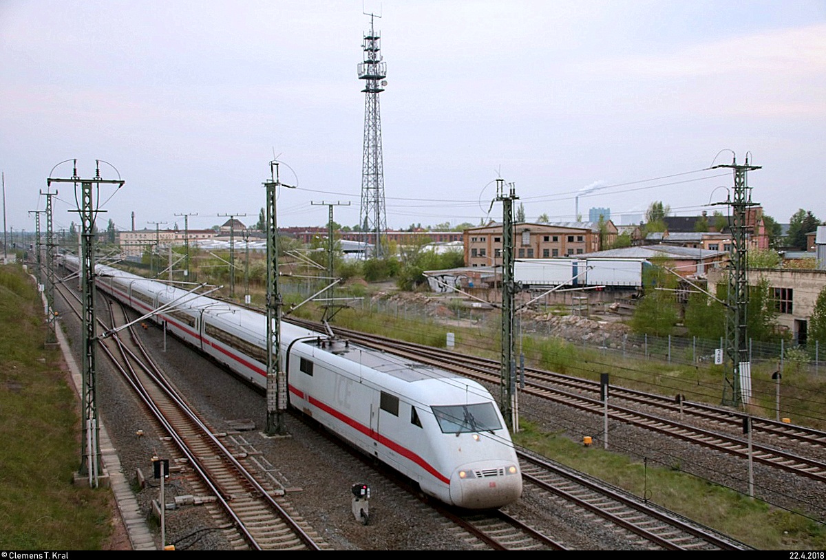 401 ??? als ICE 704 (Linie 18) von München Hbf nach Hamburg-Altona fährt in Halle-Ammendorf auf der Neubaustrecke Erfurt–Leipzig/Halle (KBS 580). Aufgenommen von der Fußgängerbrücke nahe der Europachaussee. [22.4.2018 | 19:01 Uhr]
