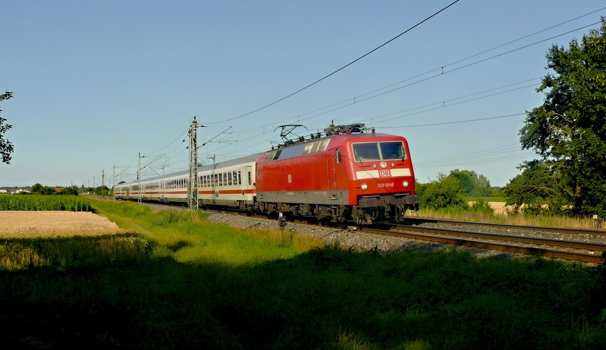 Am 02.07.2018, um 18:33 Uhr, fährt BR 120 111-0 mit dem IC 2094 von München Hbf nach Ulm Hbf. Aufgenommen in Pfuhl, kurz vor Ulm.